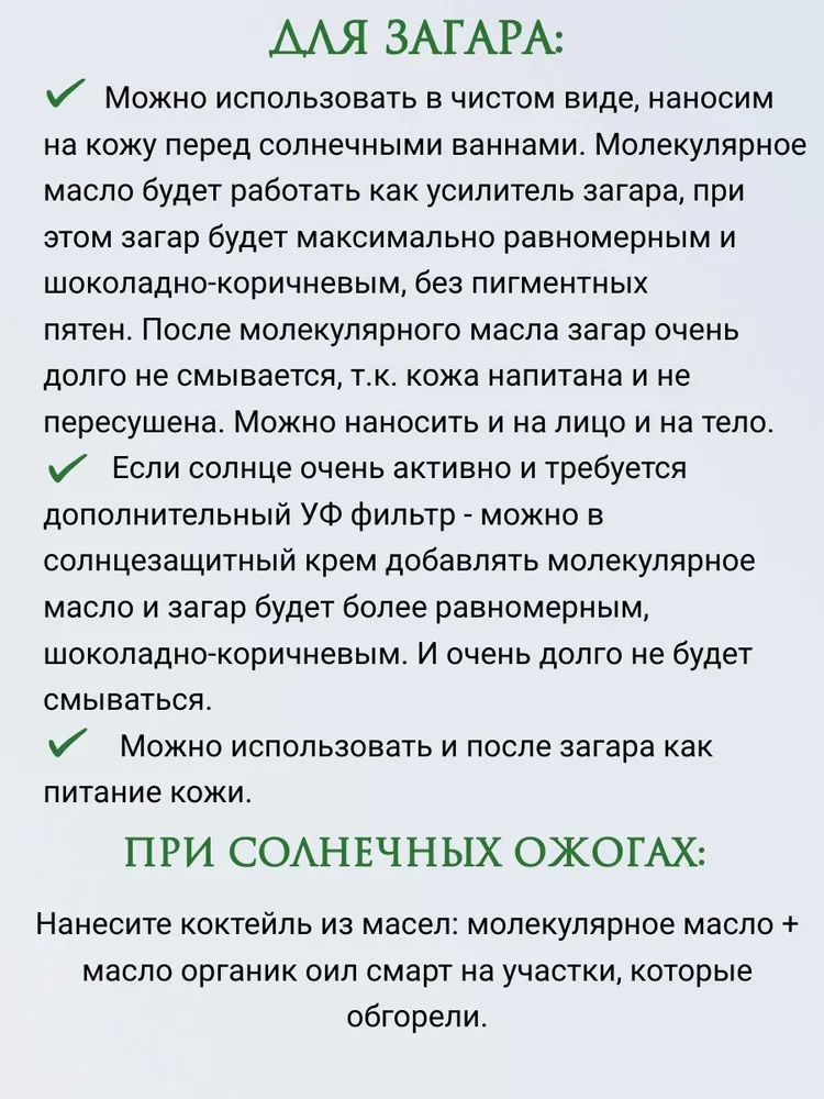 | Способ применения | Нанесите на не влажную, чистую кожу легкими, массирующими движениями. В случае сухости кожи - добавить каплю воды в каплю молекулярного смарт масла. |