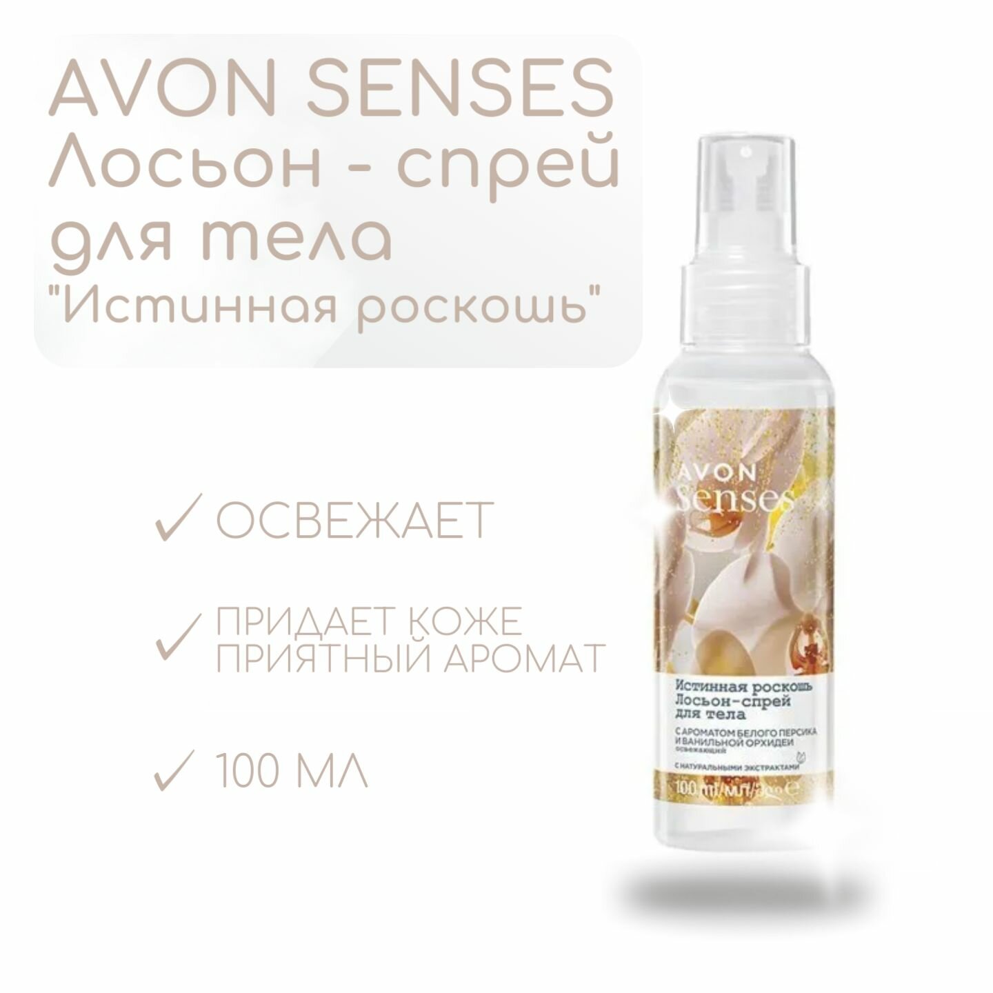 Купить AVON Лосьон-спрей для тела Истинная роскошь, с ароматом белого персика и ванильной орхидеи, 100 мл