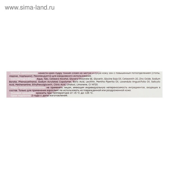 | Способ применения | нанести крем-пудру тонким слоем на чистую и сухую кожу зон с повышенным потоотделением (стопы, ладони, подмышки). Рекомендуется для ежедневного использования. |