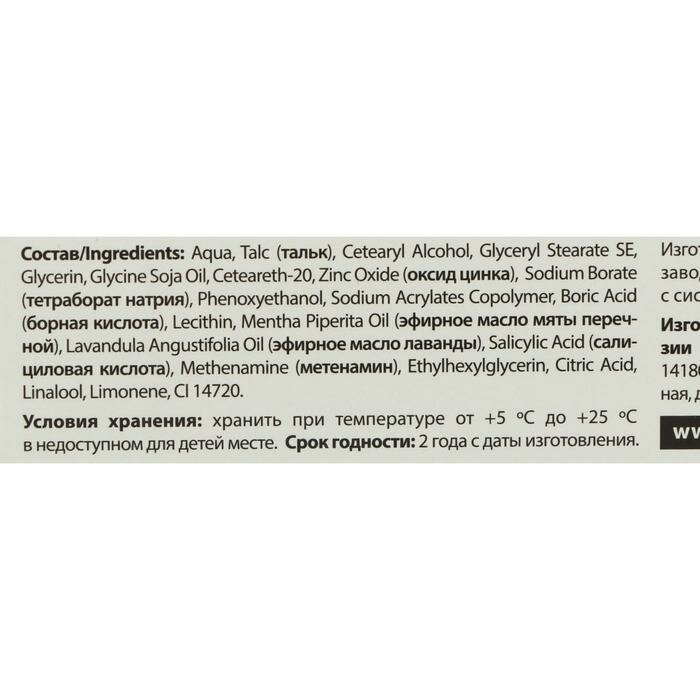 | Состав | aqua, talc, cetearyl alcohol, glyceryl stearate se, glycerin, glycine soja oil, ceteareth-20, zinc oxide, sodium borate,phenoxyethanol, sodium acrylates copolymer, boric acid, lecithin, mentha piperita oil, lavandula angustifolia oil, salicylic acid, methenamine, ethylhexylglycerin, citric acid, linalool, limonene, сi 14720 |