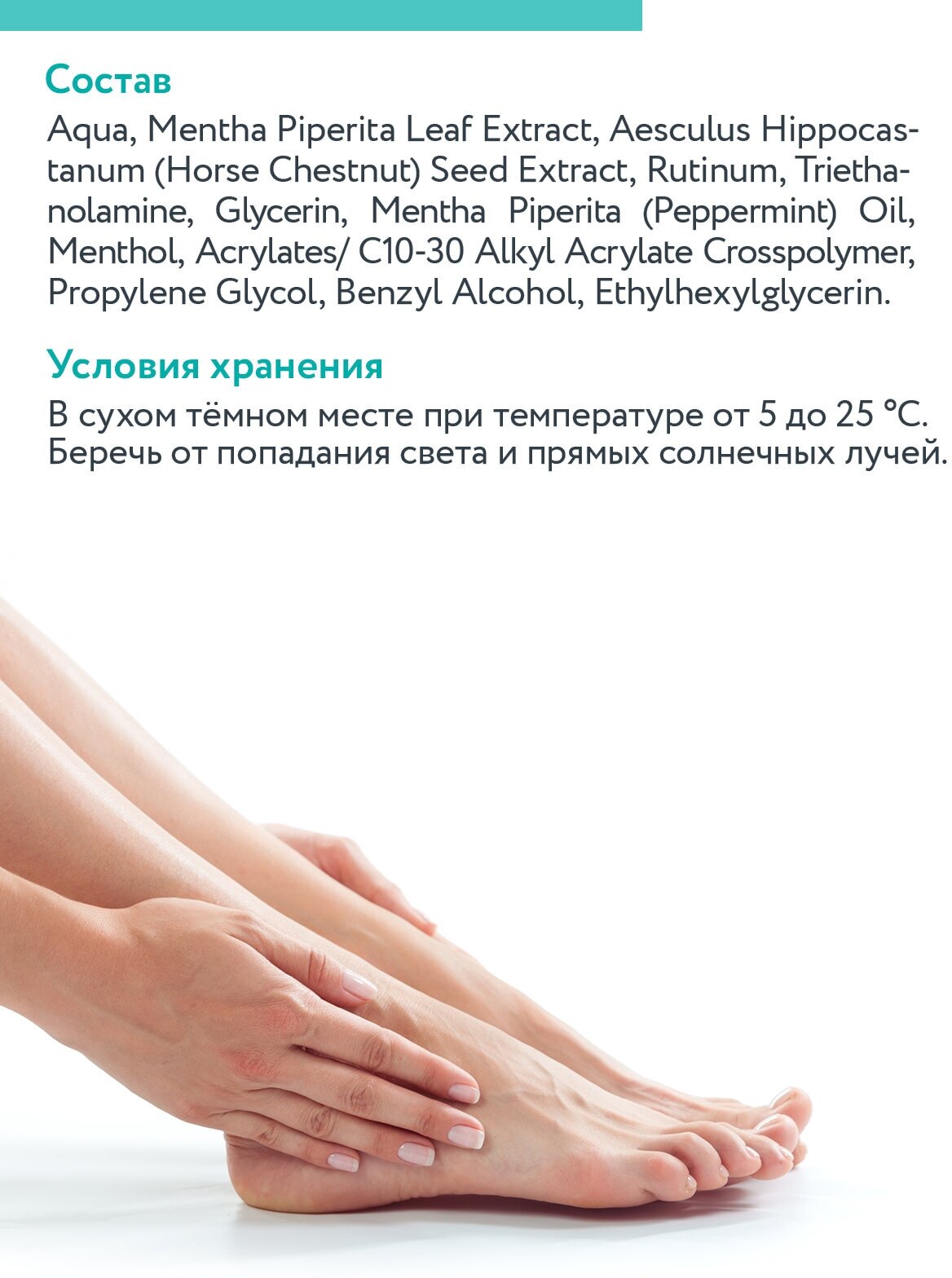 | Состав | Aqua, Mentha Piperita Leaf Extract, Aesculus Hippocastanum (Horse Chestnut) Seed Extract, Rutinum, Triethanolamine, Glycerin, Mentha Piperita (Peppermint) Oil, Menthol, Acrylates/ C10-30 Alkyl Acrуlate Crosspolymer, Propylene Glycol, Benzyl Alcohol, Ethylhexylglycerin. |
