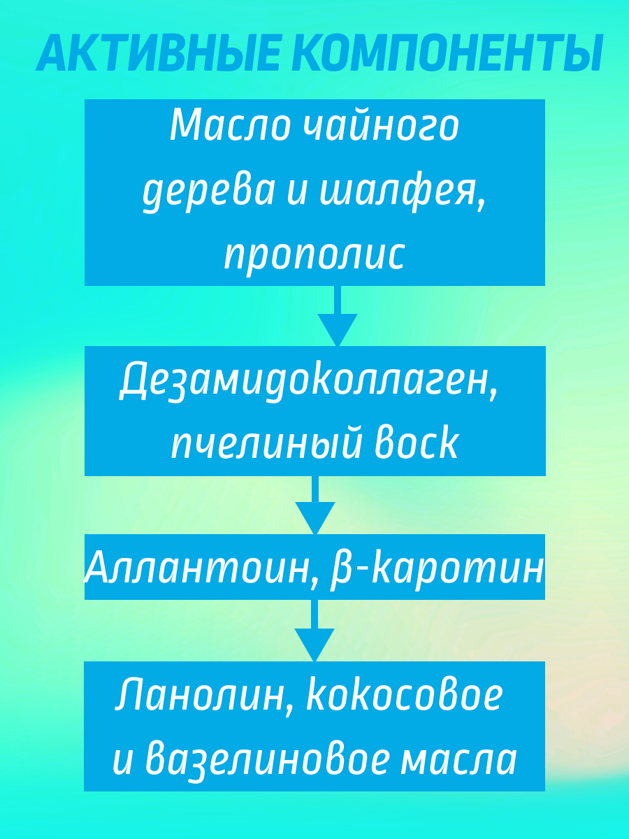 | Активный ингредиент | аллантоин / бета-каротин / воск / воск пчелиный / глицерин / ланолин / прополис / спирт |