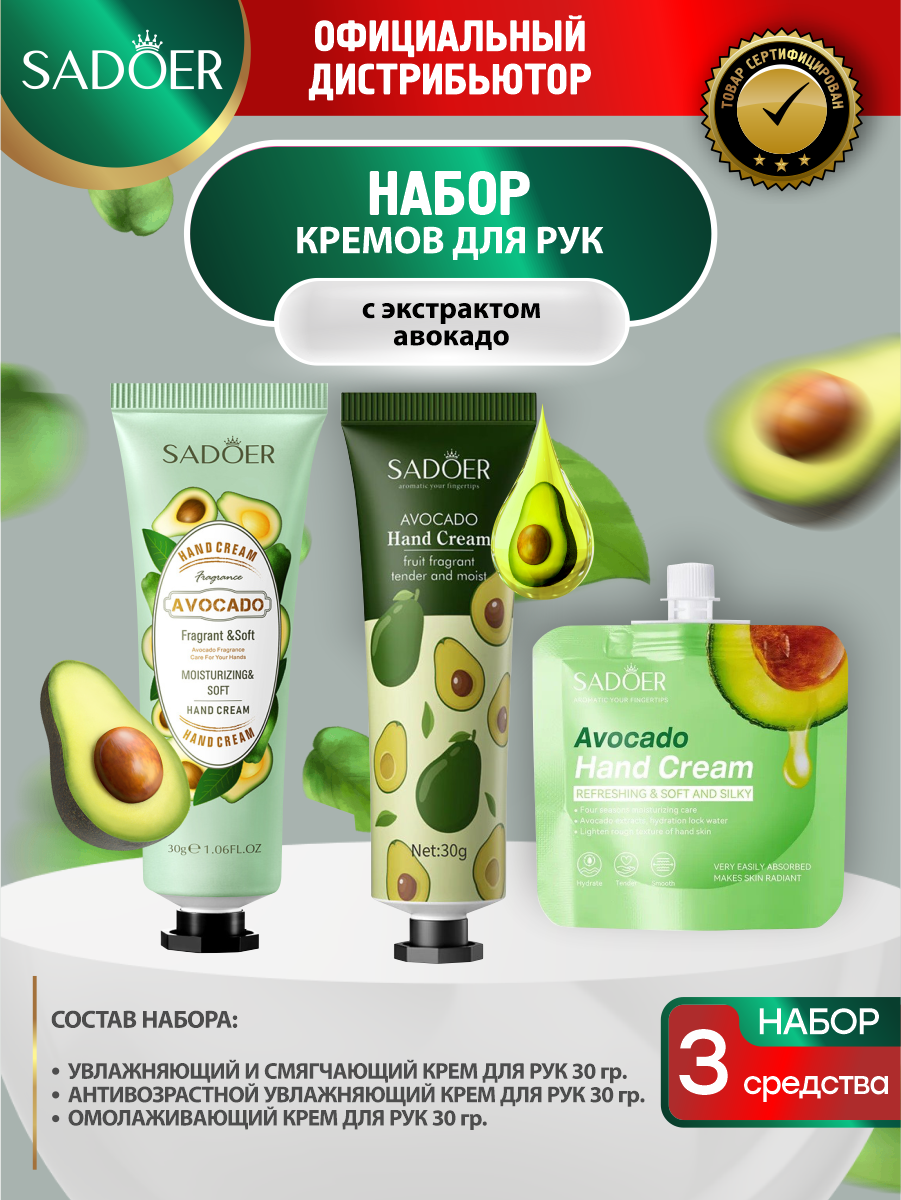 Купить Набор кремов для рук Sadoer с экстрактом авокадо Увлажняющий+Антивозрастной+Омолаживающий по 30 гр.