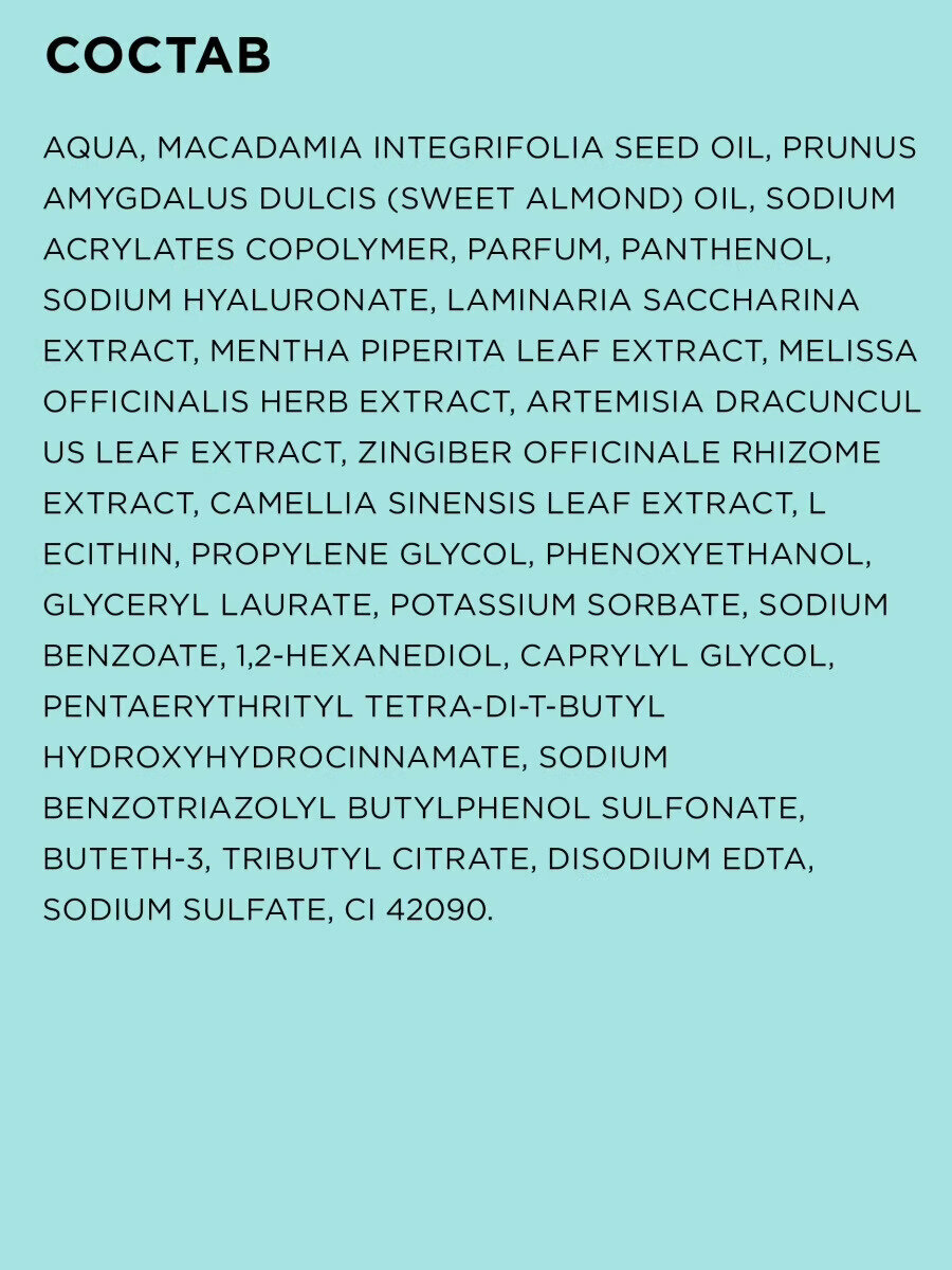 | Cостав | Вода, масло миндаля, пропиленгликоль, изогексадекан, стеарет-2, глицерилстеарат, цетеариловый спирт, стеарет-21, ПГГ-15 стеариловый эфир, отдушка, масло манго, масло макадамии, токоферол, экстракт ананаса, экстракт меда, экстракт арники, экстракт клубники, экстракт манго, экстракт имбиря, экстракт чая зеленого, экстракт чая белого, бензоат натрия , сорбат калия, ксантановая камедь, акрилаты/С10-30 алкил акрилат кроссполимер, пентаэритритил тетра-ди-т-бутил гидроксигидроциннамат, бензотриазолилбутилфенол сульфонат натрия, бутет-3, трибутил цитрат, феноксиэтанол, глицерил лаурат, динатрий ЭДТА, CI 15985 |