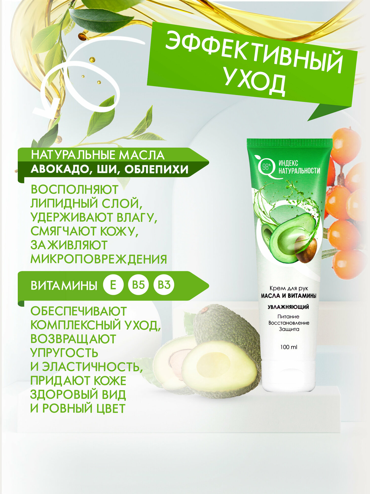 | Масла и экстракты | масло авокадо / масло сои / масло ши (карите) / облепиховое масло |