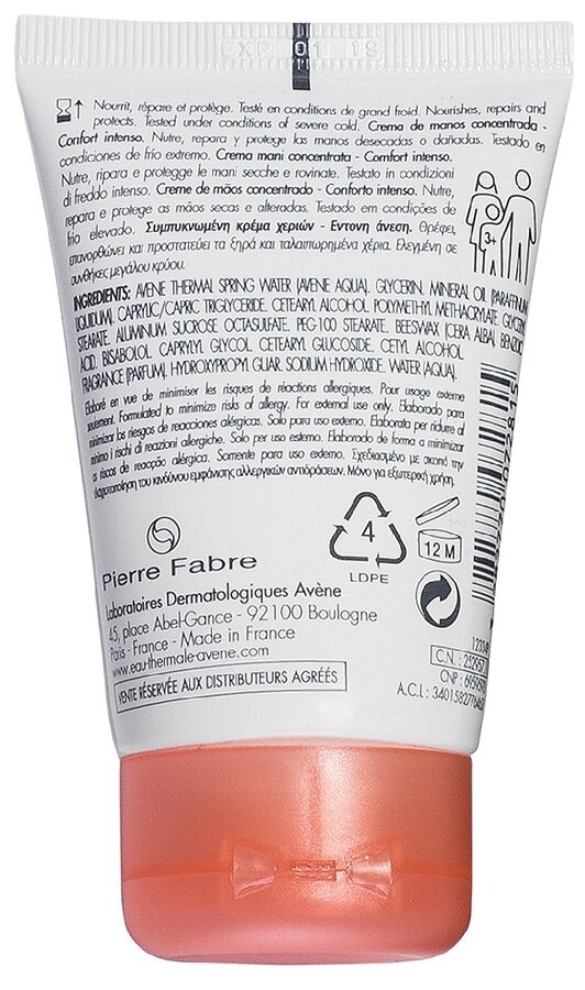 | Cостав | avene thermal spring water (avene aqua), glycerin, mineral oil (paraffinum liquidum), caprylic/capric triglyceride, cetearyl alcohol, polymethyl methacrylate, glyceryl stearate, aluminum sucrose octasulfate, peg-100 stearate, beeswax (cera alba), benzoic acid, bisabolol, caprylyl glycol, cetearyl glucoside, cetyl alcohol, fragrance (parfum), hydroxypropyl guar, sodium hydroxide, water (aqua) |