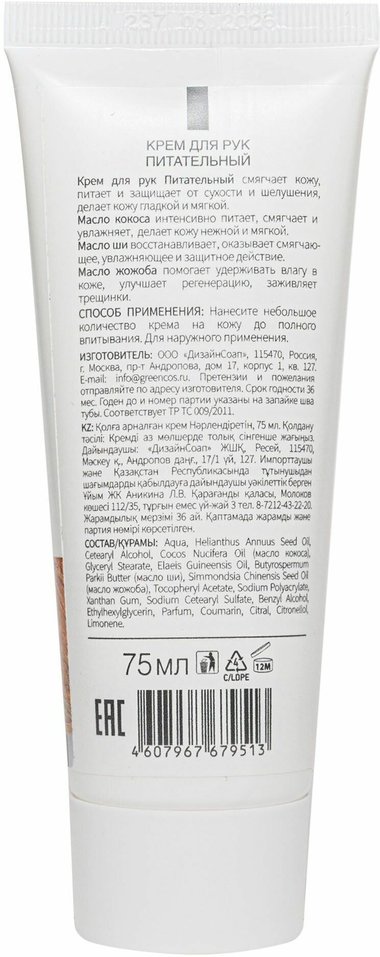 | Дополнительная информация | "Крем для рук Питательный смягчает кожу, питает и защищает от сухости и шелушения, делает кожу гладкой и мягкой. Масло кокоса интенсивно питает, смягчает и увлажняет, делает кожу нежной и мягкой. Масло ши восстанавливает, оказывает смягчающее, увлажняющее и защитное действие. Масло жожоба помогает удерживать влагу в коже, улучшает регенерацию, заживляет трещинки." |