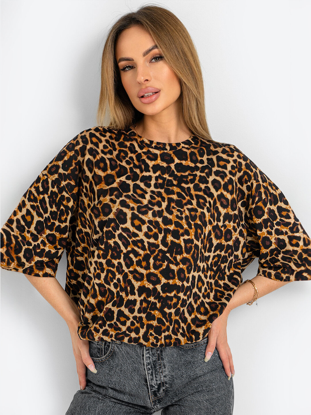 Футболка женская оверсайз с принтом леопард HappyFox HF096SP леопард.бежевый 48-50