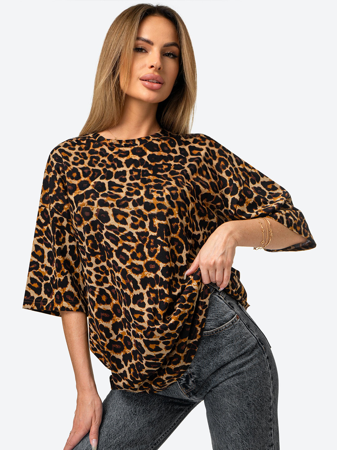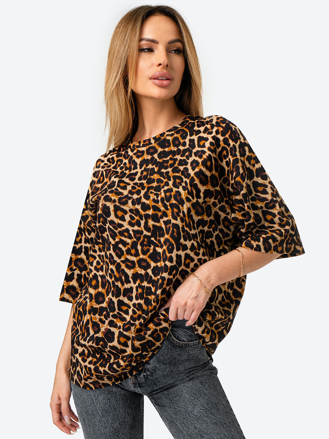 Футболка женская оверсайз с принтом леопард HappyFox HF096SP леопард.бежевый 44-46