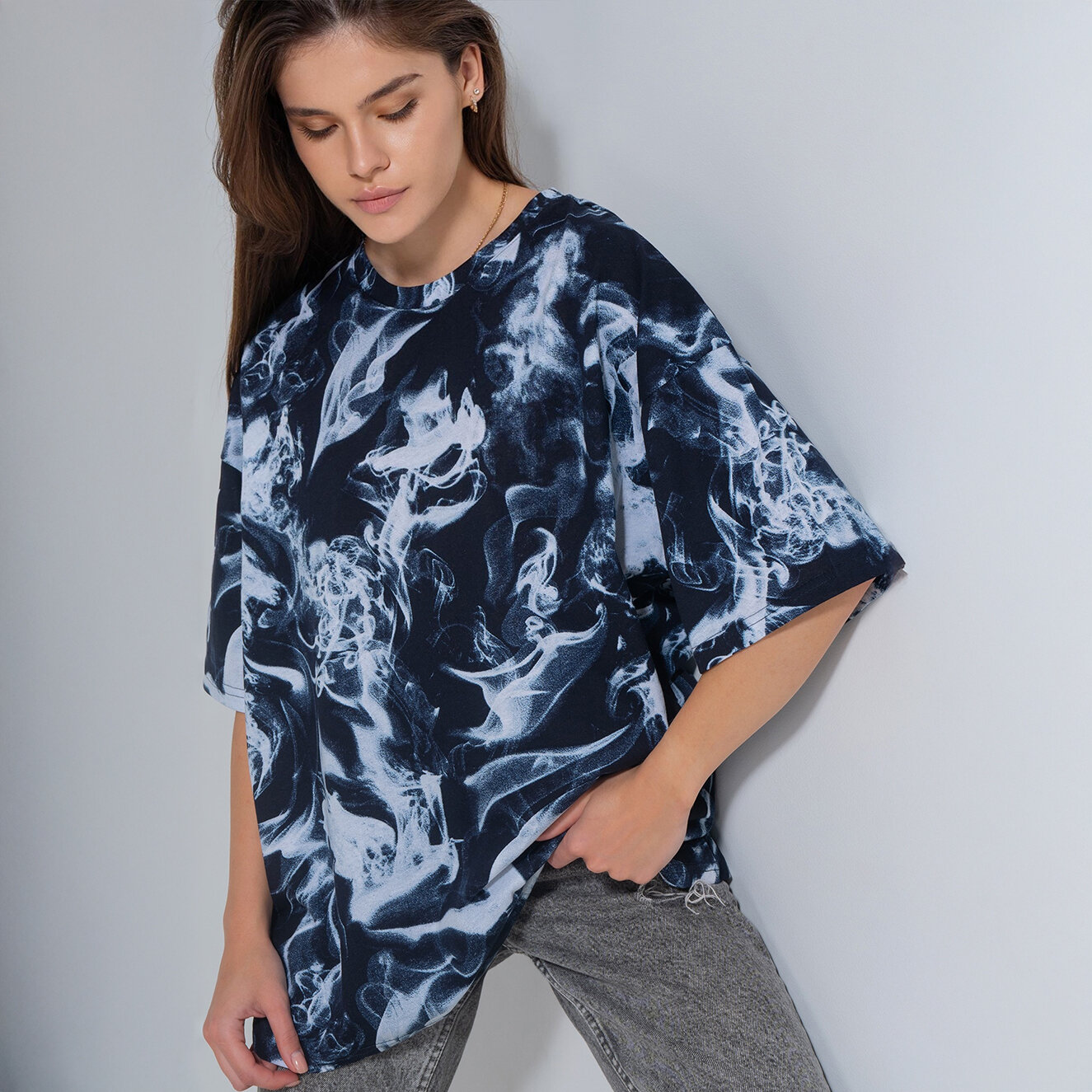 Футболка женская оверсайз с принтом унисекс хлопок, HappyFox, HF096SPразмер 48-50, цвет дым.на.т.синем