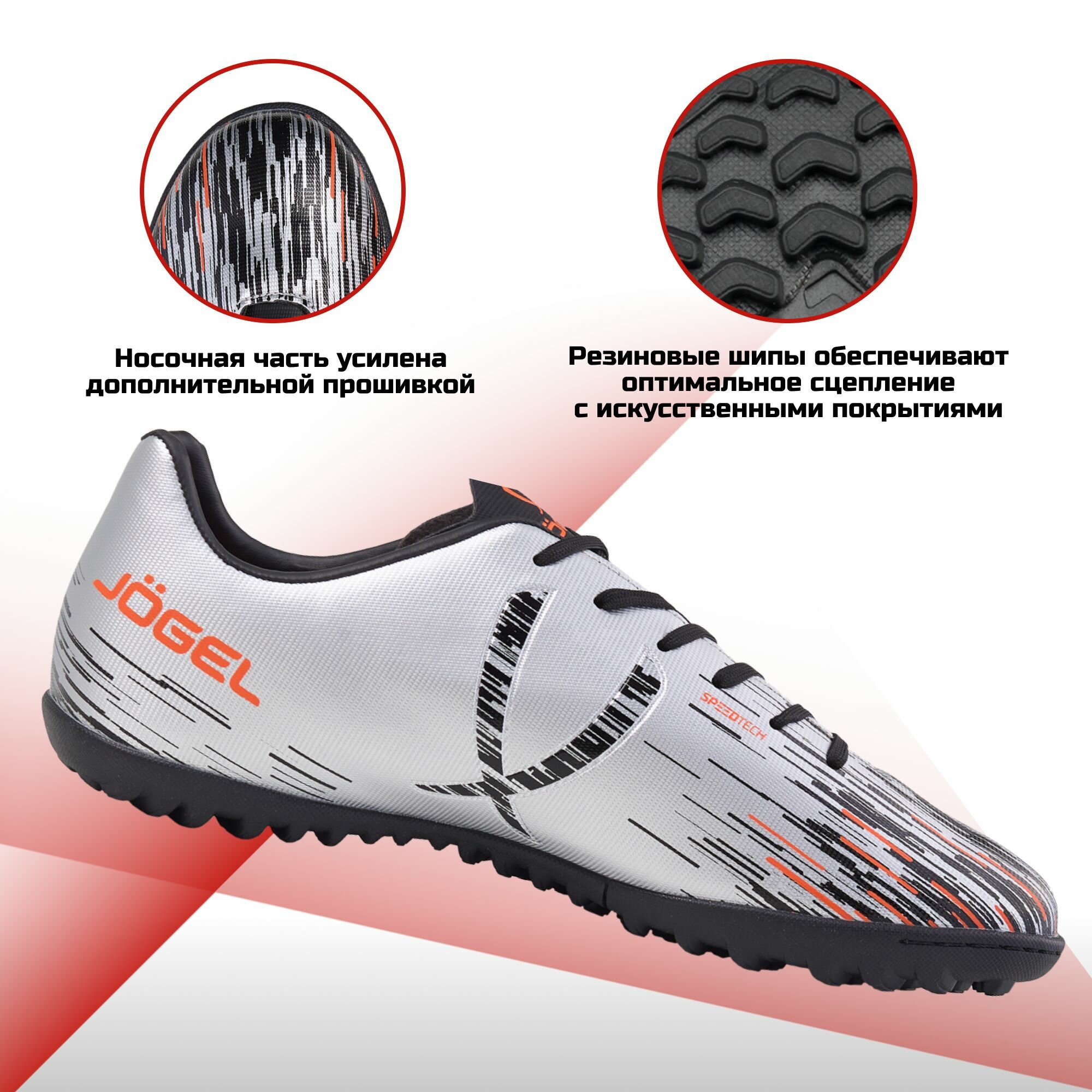 Бутсы Jogel Rapido футбольные. Бутсы сороконожки для футбола. Анатомическая колодка, мягкая стелька. Многошиповые, резиновая подошва для искусственных поверхностей, оптимальное сцепление. Технология Speedtech. Цвет серебристый, размер 45