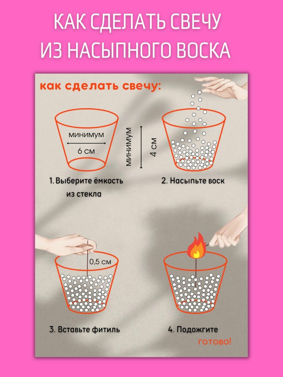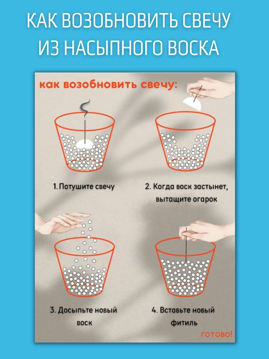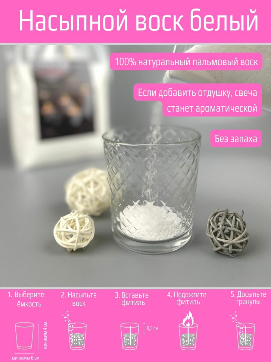 | Дополнительная информация | 1000 грамм 1) 1 пакет гранулированного воска по 1 кг 2) 1 метр фитиля хлопкового, нарезанный по 25 см. 3) Подсвечник в набор не входит |