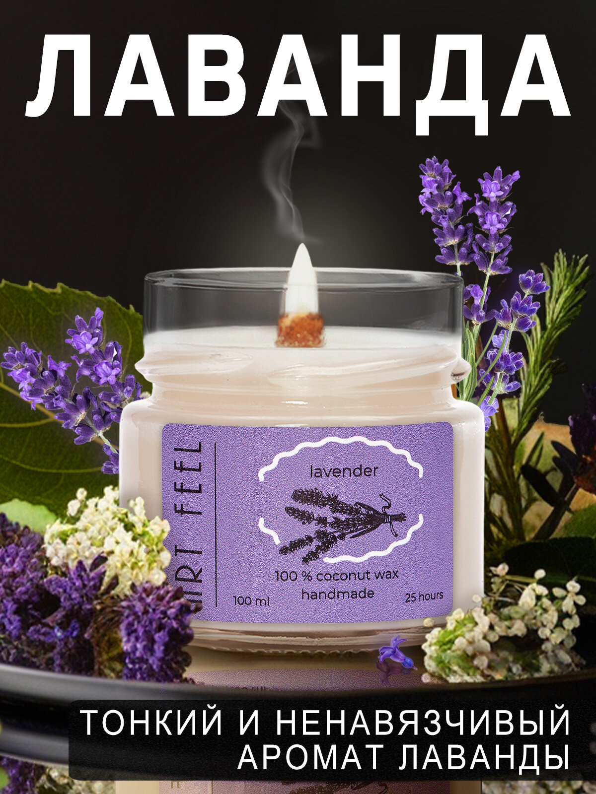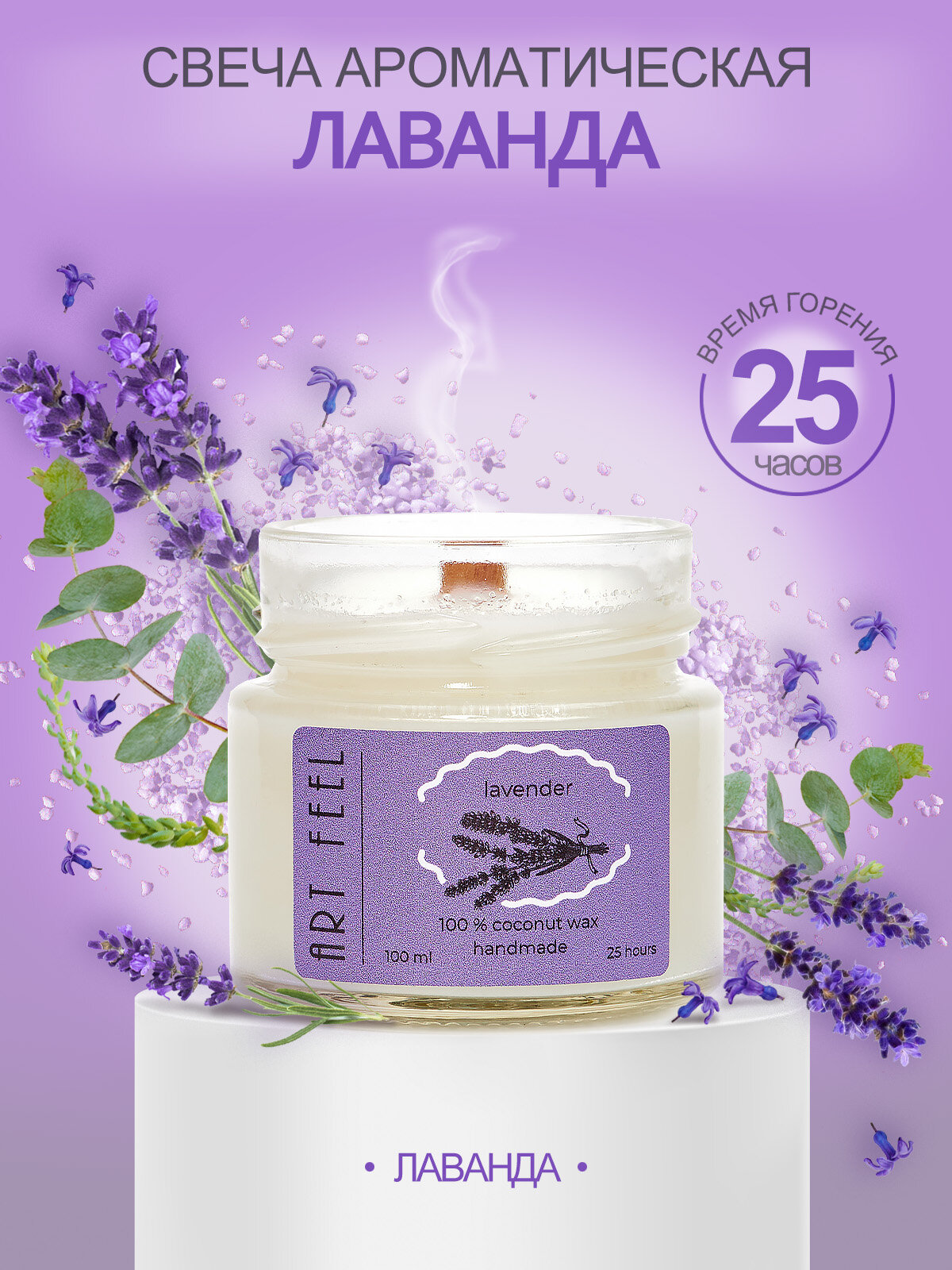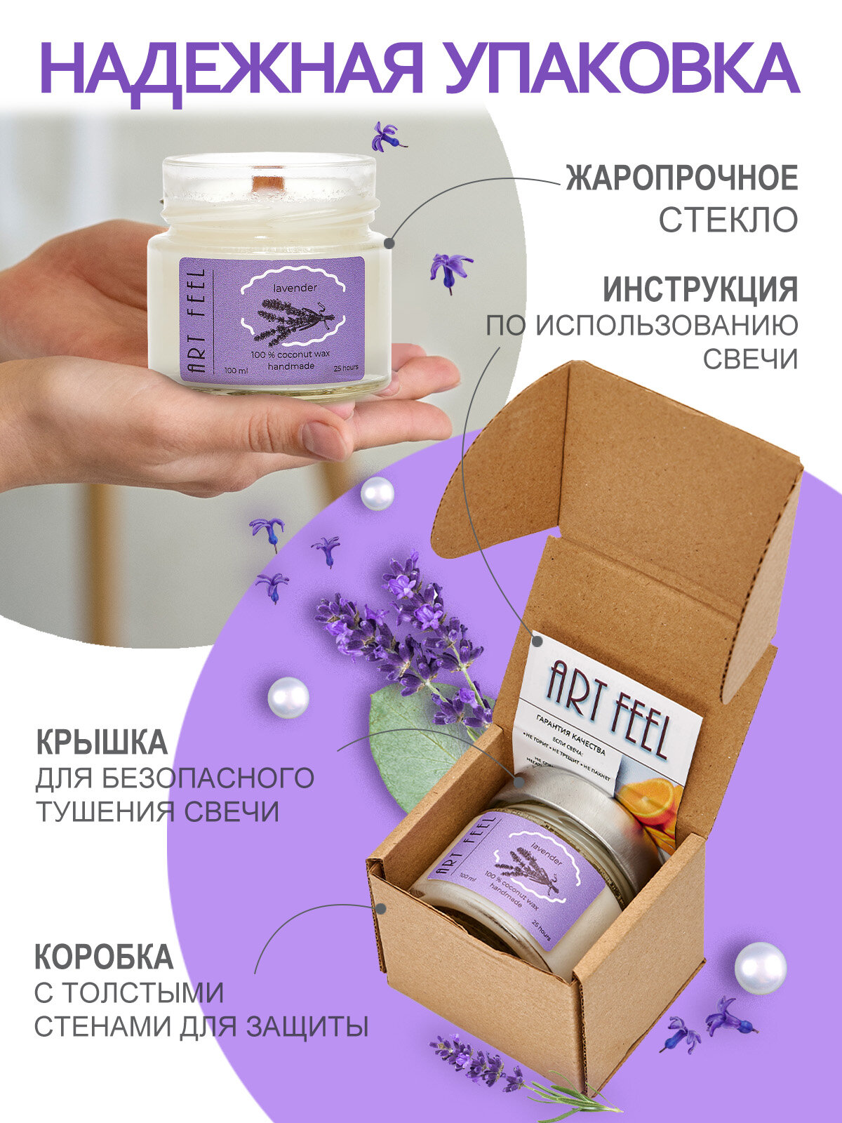 Купить Ароматизированная свеча ART FEEL с запахом лаванды / Двойной деревянный фитиль с треском /100мл / 25ч горения / Ручная работа / Handmade