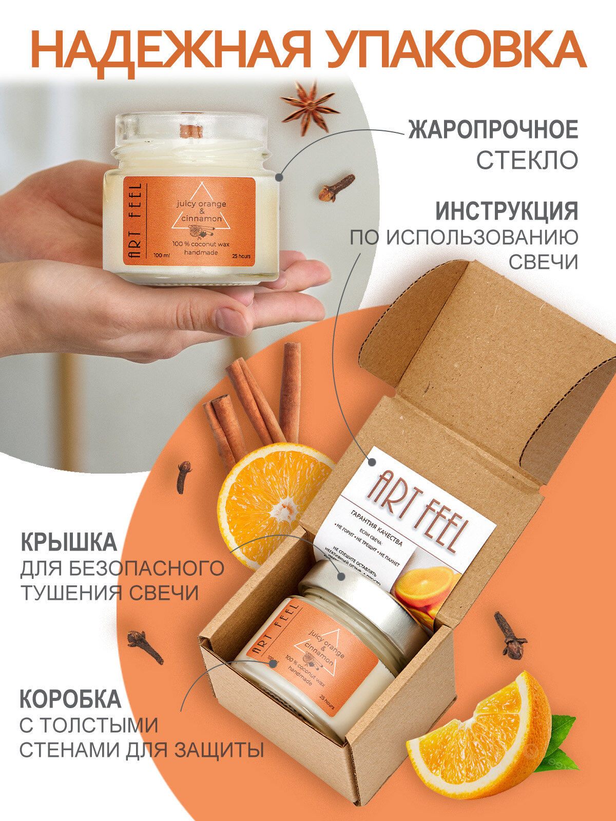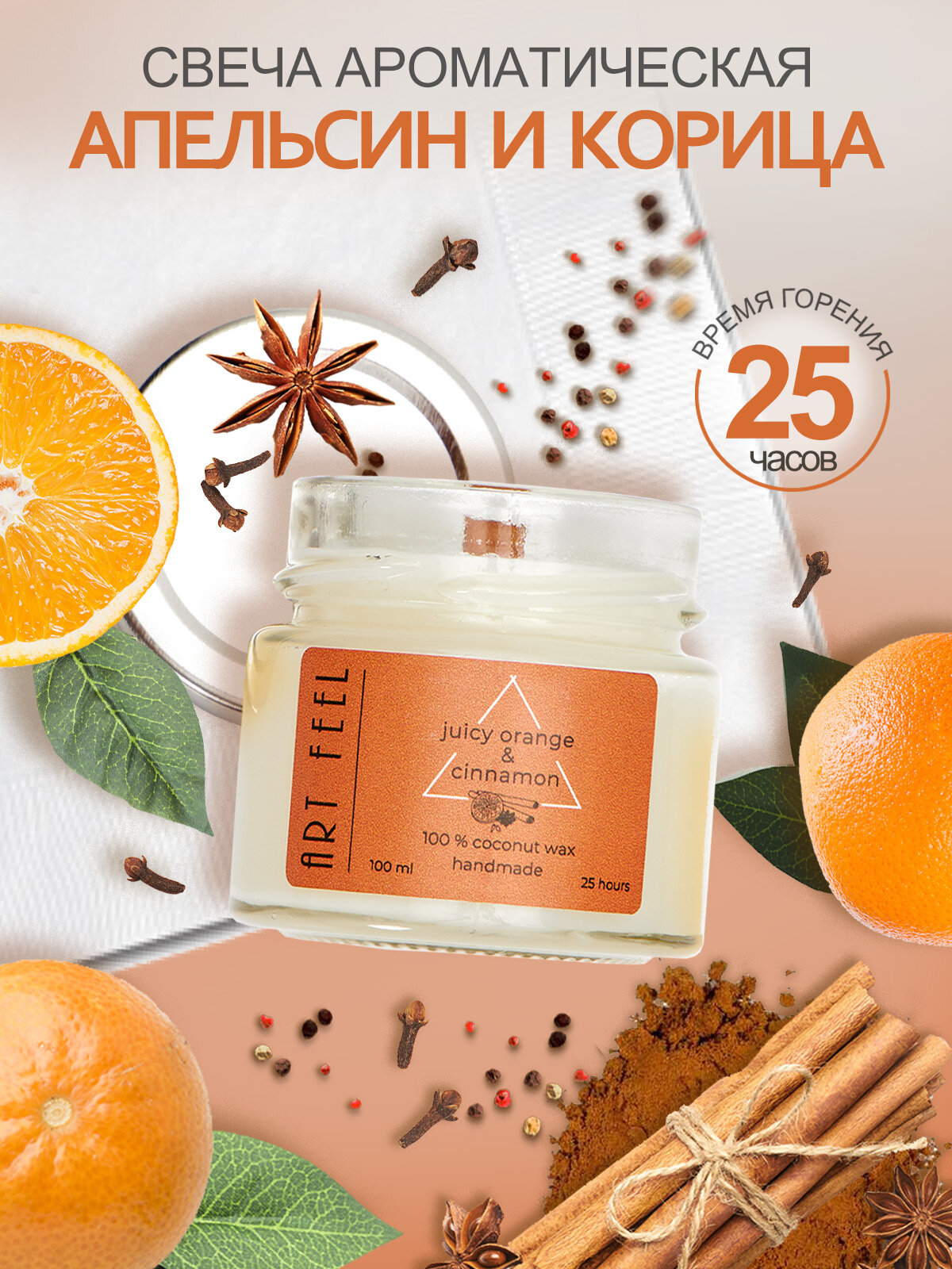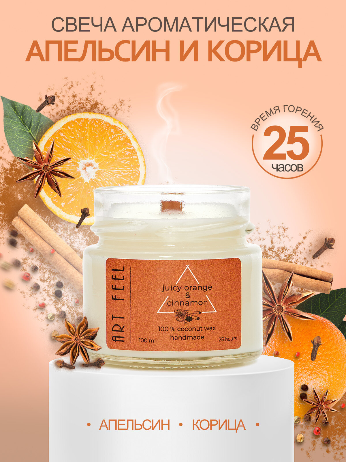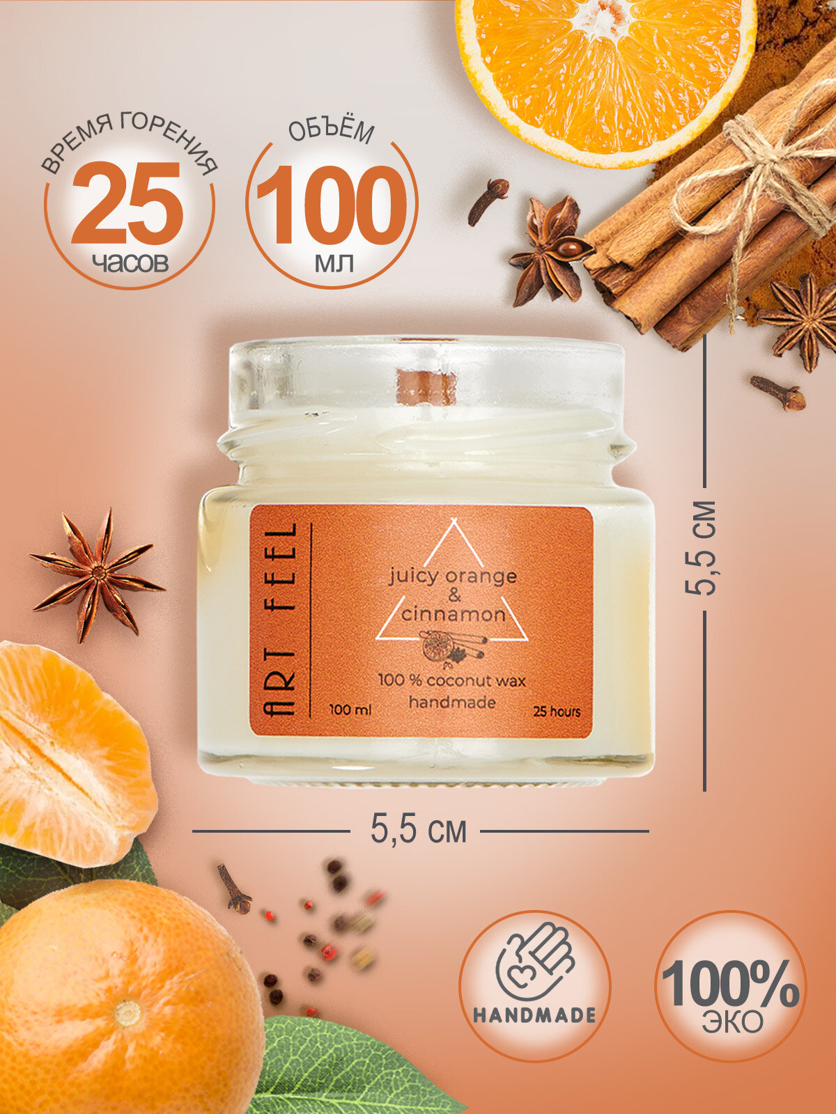 Купить Ароматизированная свеча ART FEEL с запахом апельсина И корицы / Двойной деревянный фитиль с треском /100мл / 25ч горения / Ручная работа / Handmade