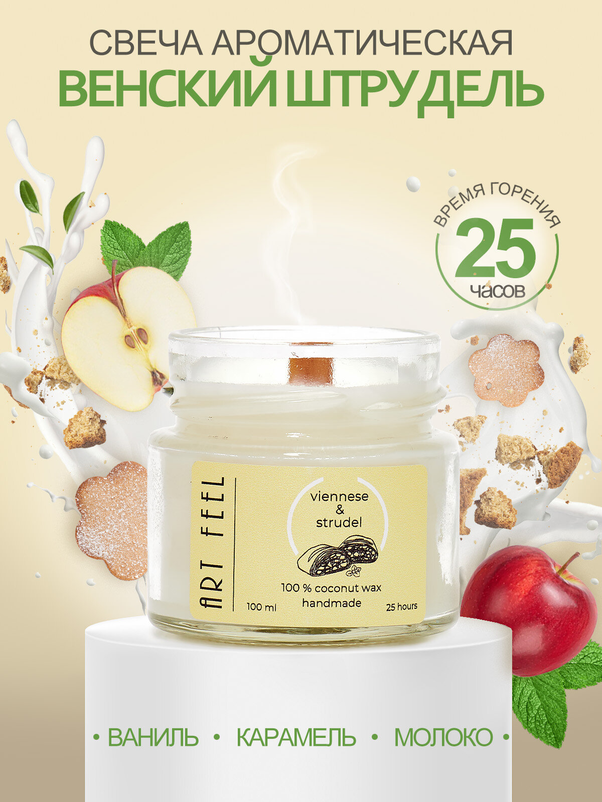 Купить Ароматизированная свеча ART FEEL с запахом венского штруделя / Двойной деревянный фитиль с треском /100мл / 25ч горения / Ручная работа / Handmade
