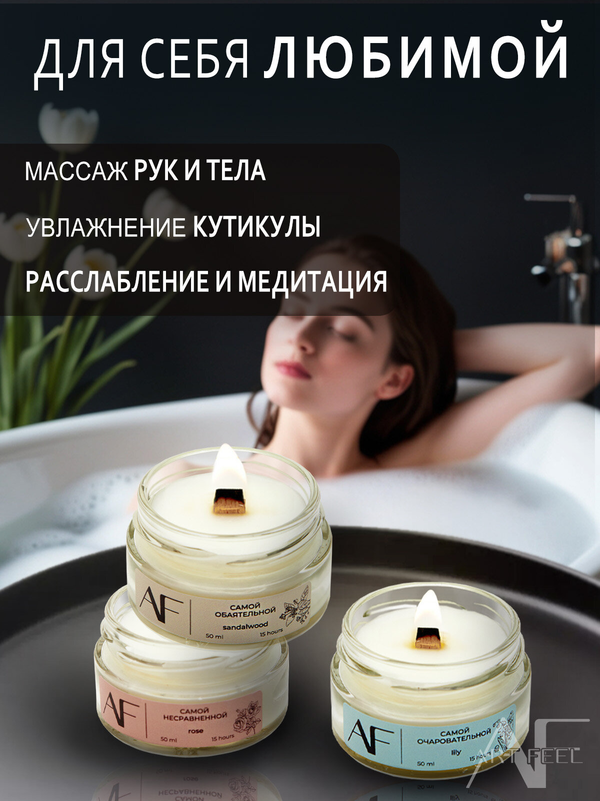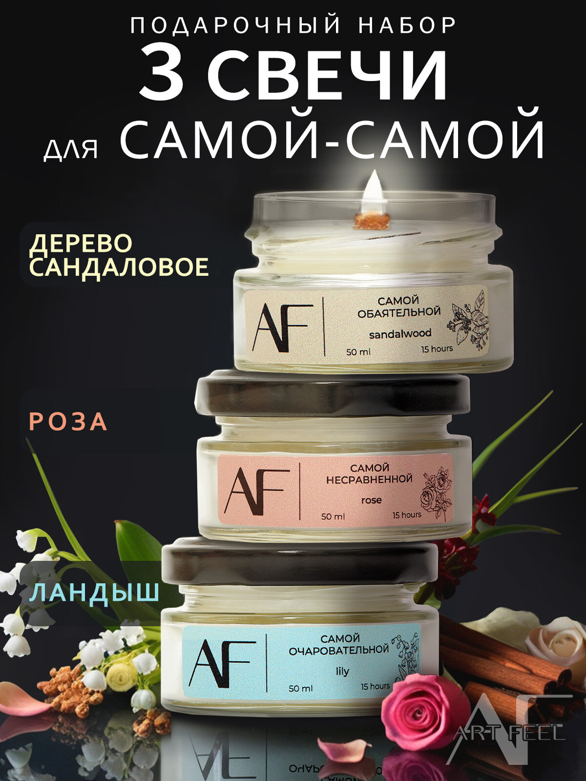 Купить Свечи "ART FEEL" - набор из 3-х свечей с ароматом сандалового дерева, ландыша, розы