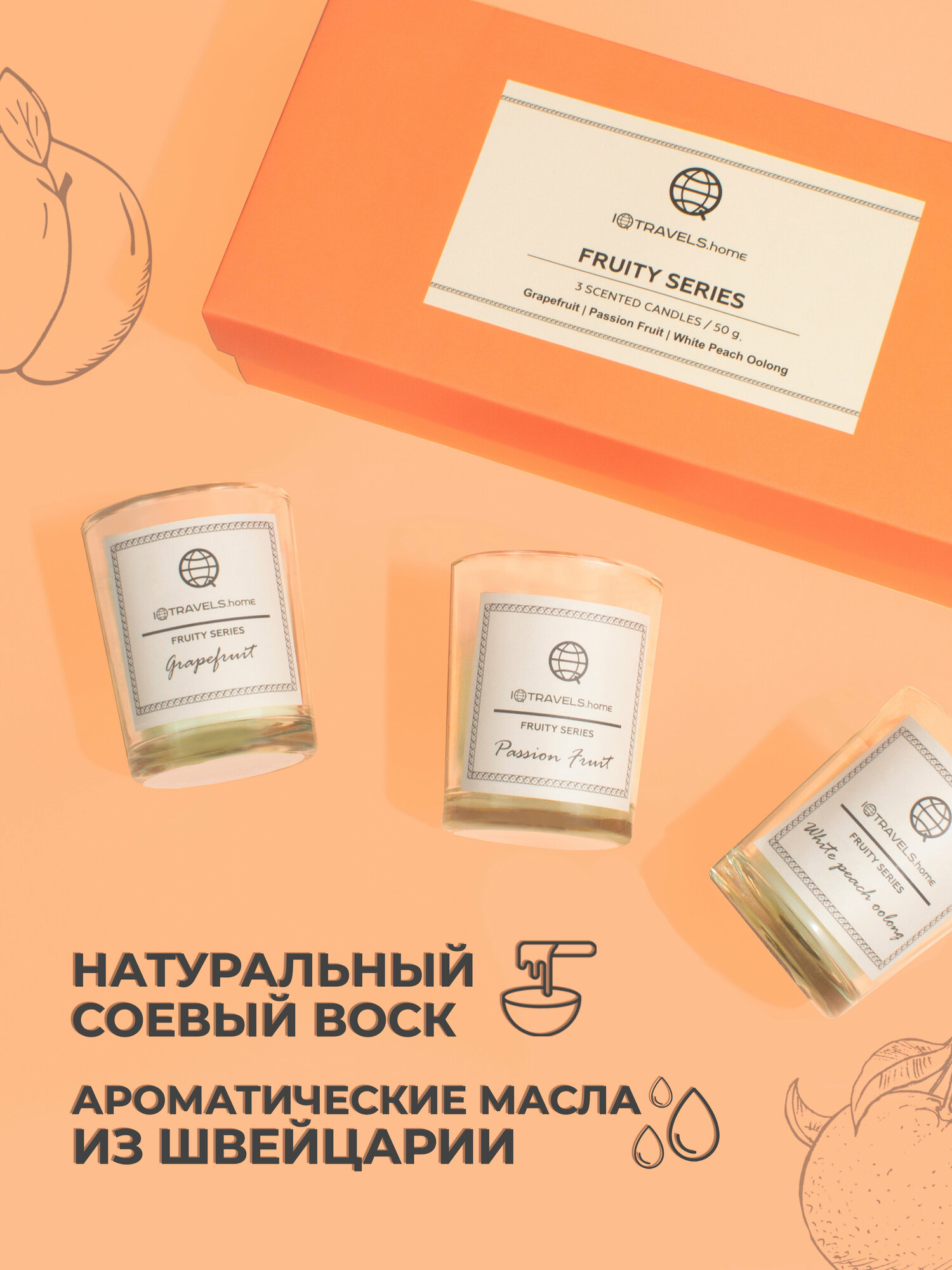 Купить Набор ароматических свечей IQTRAVELS - Фруктовая серия (Грейпфрут, Маракуйя, Белый Персик)