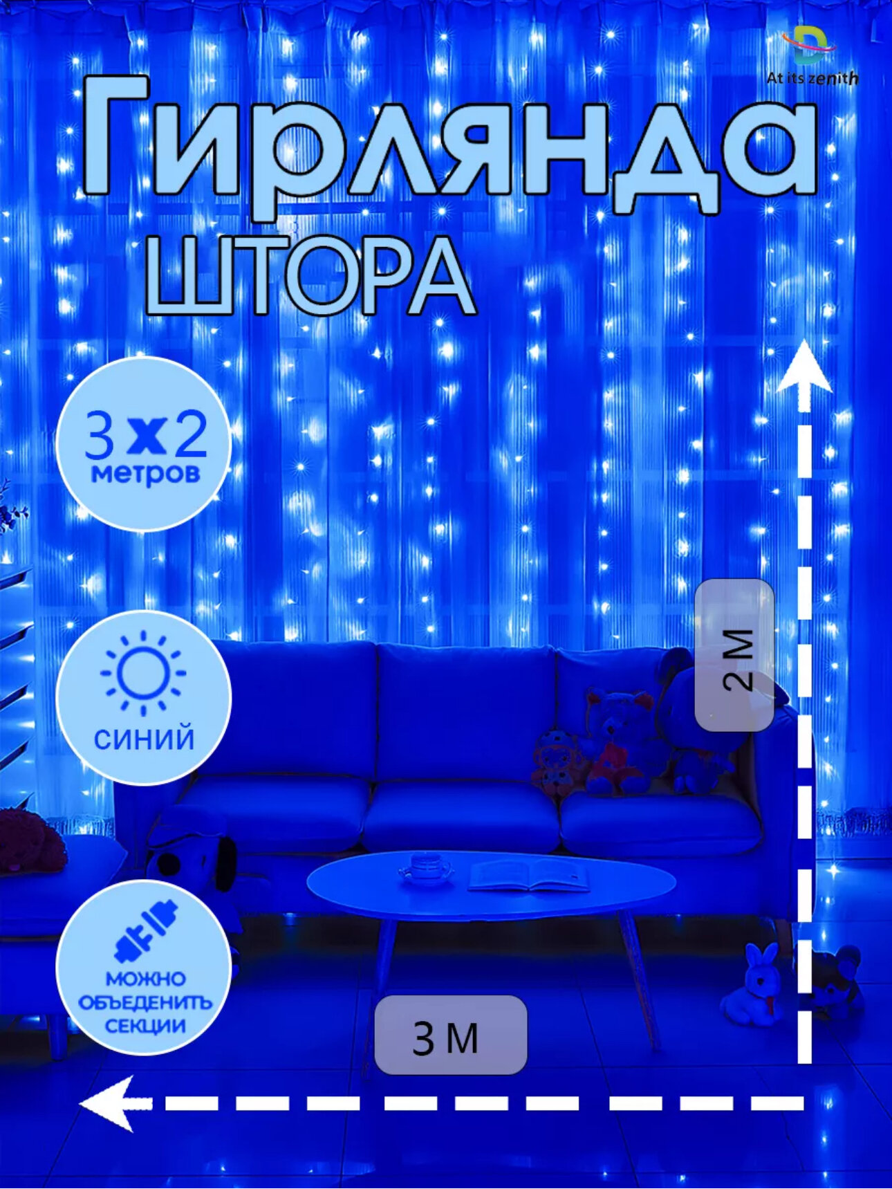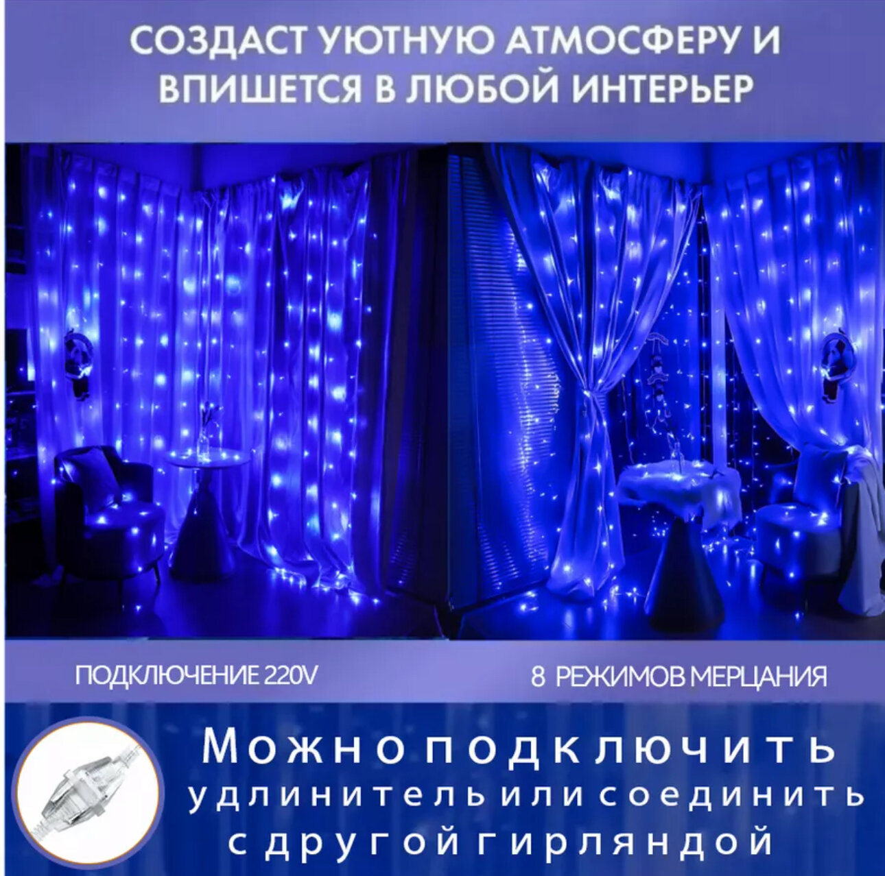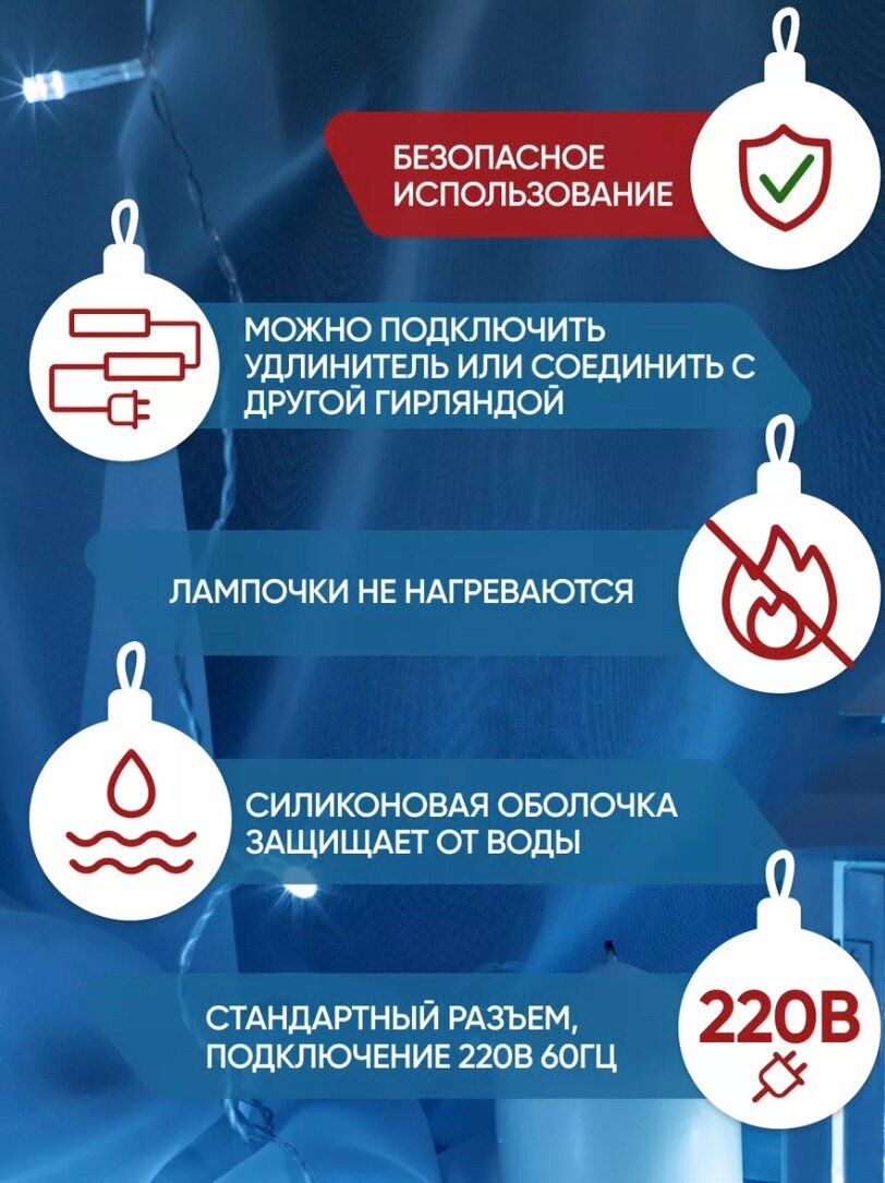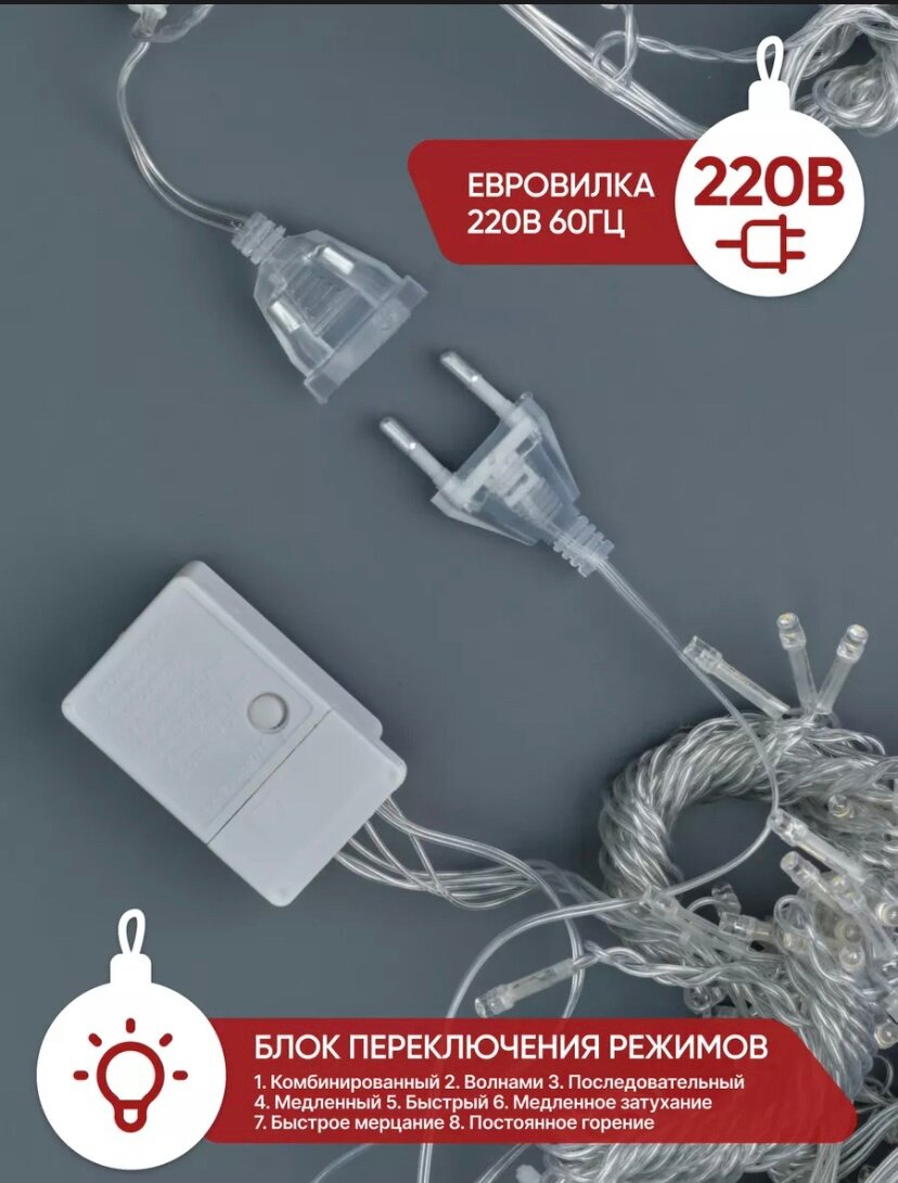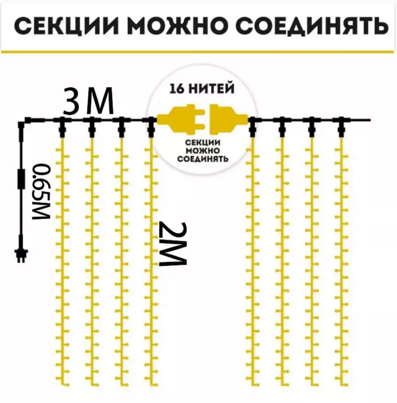 | Дополнительная информация | Мягкий теплый свет. - Гирлянда занавес, Гирлянда штора 3х2 метра самый оптимальный размер - В комплекте 2 вилки, одна для подключения в сеть 220В, другая вилка штекер для соединения с другими гирляндами (при желании удлинить) |
