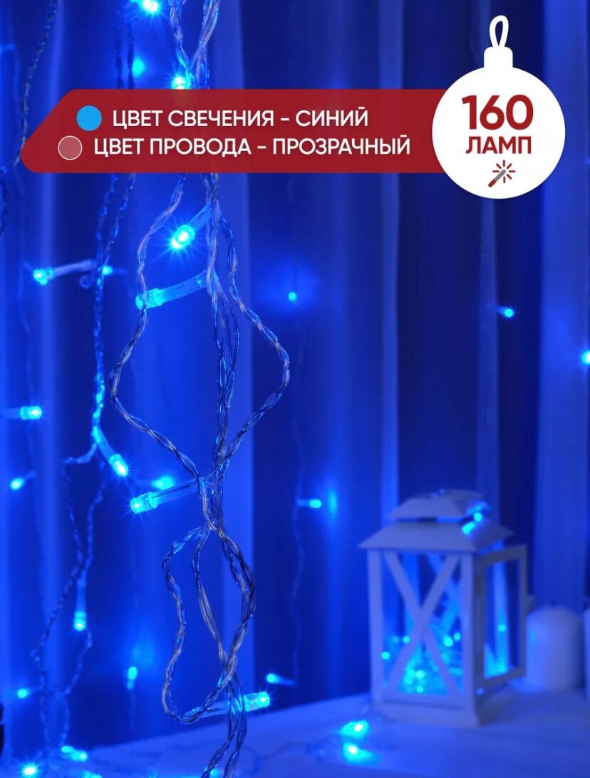 Гирлянда электрическерная 3х2 метра Новый Гая интерьод 2023 /320 LED/Светодиодная штора- занавес/Световой дождь/Тюль /синий/Серия: Лапландия