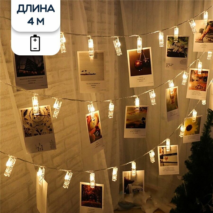 Купить Гирлянда светодиодная с прищепками для фото, теплый белый, 400 см
