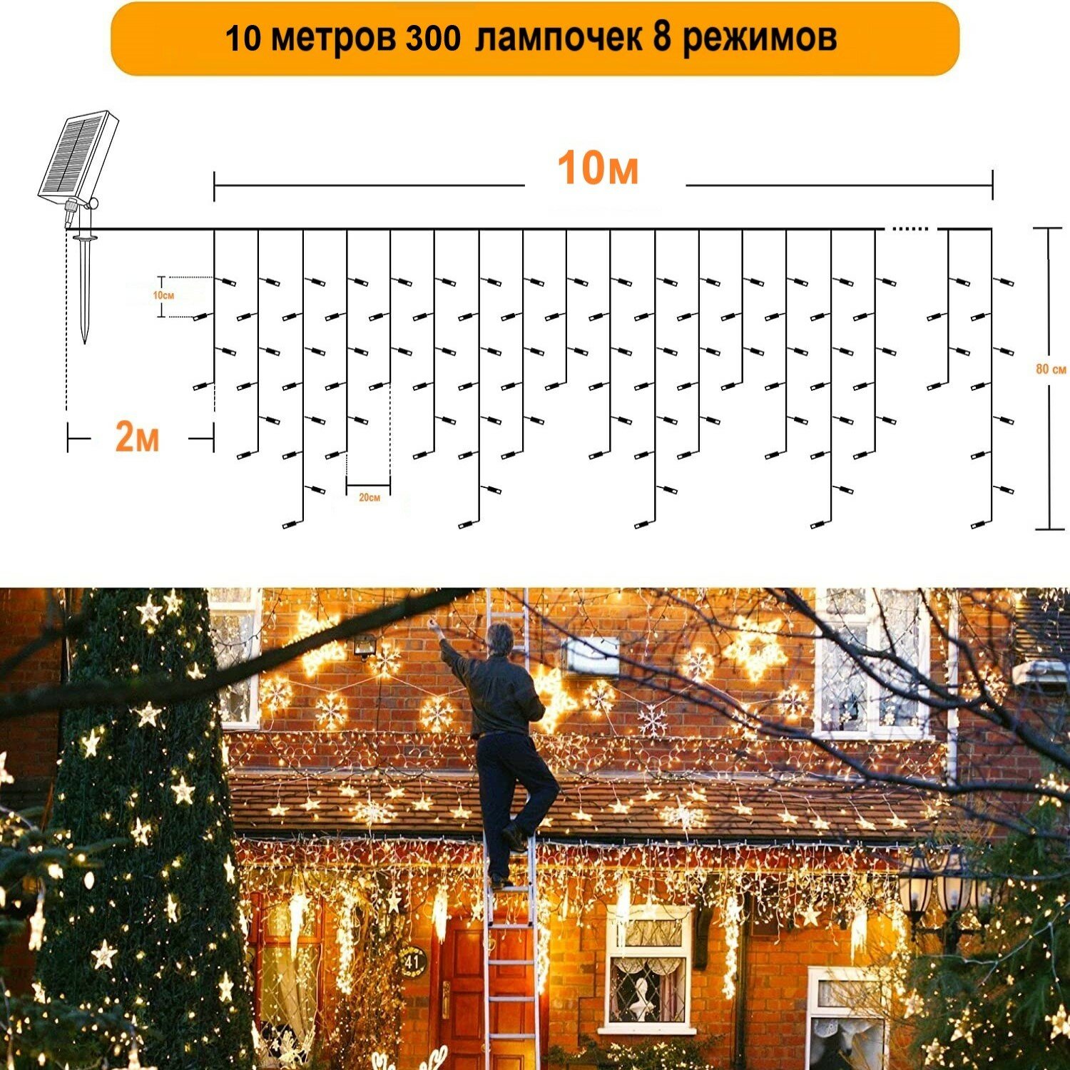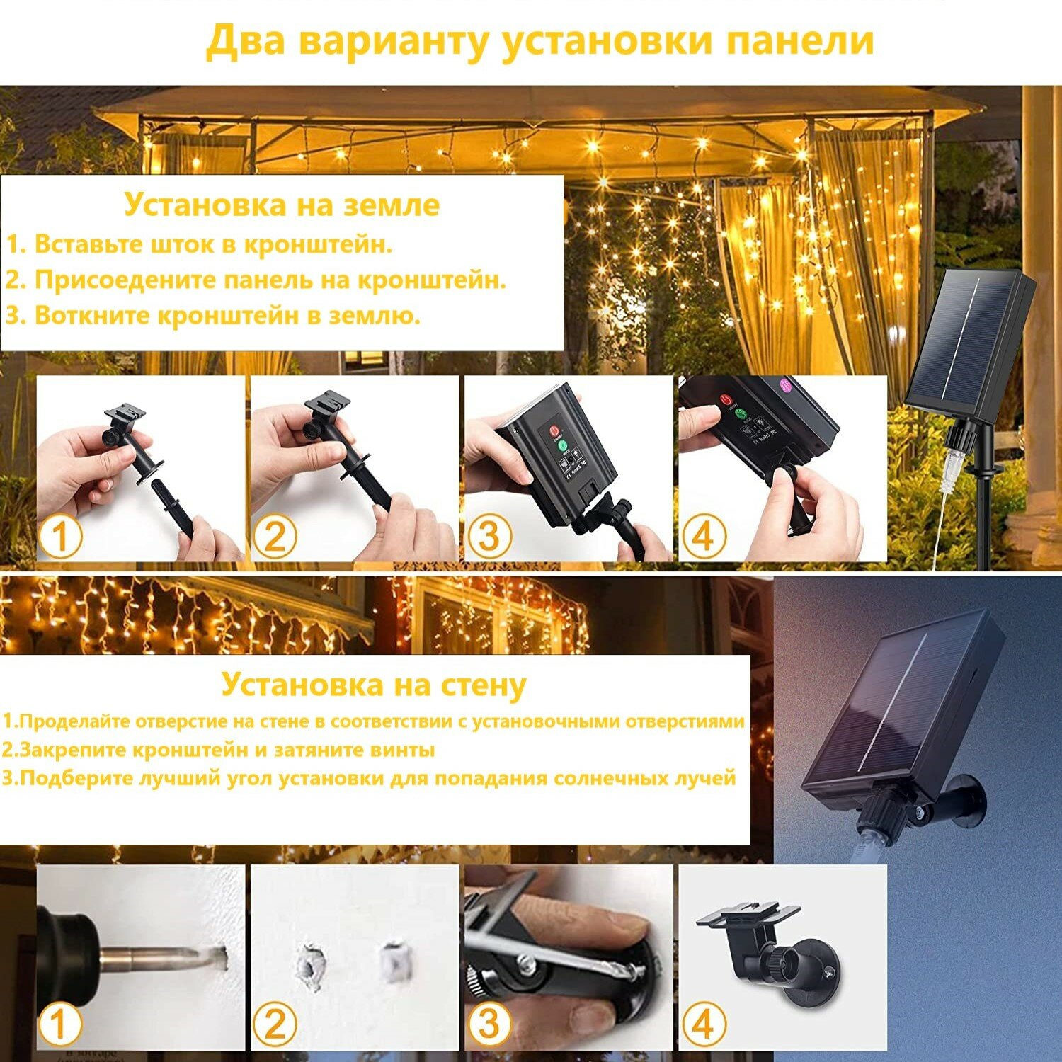 | Комплектация | Гирлянда, солнечная панель со выстроенным аккумулятором, шток для закрепления панели, пульт ДУ, монтажный комплект на стену. |