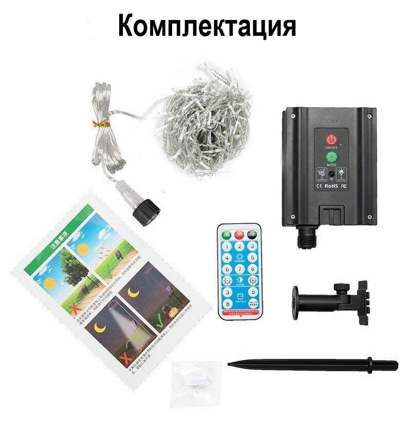 | Комплектация | Гирлянда, солнечная панель со выстроенным аккумулятором, шток для закрепления панели, пульт ДУ, монтажный комплект на стену. |