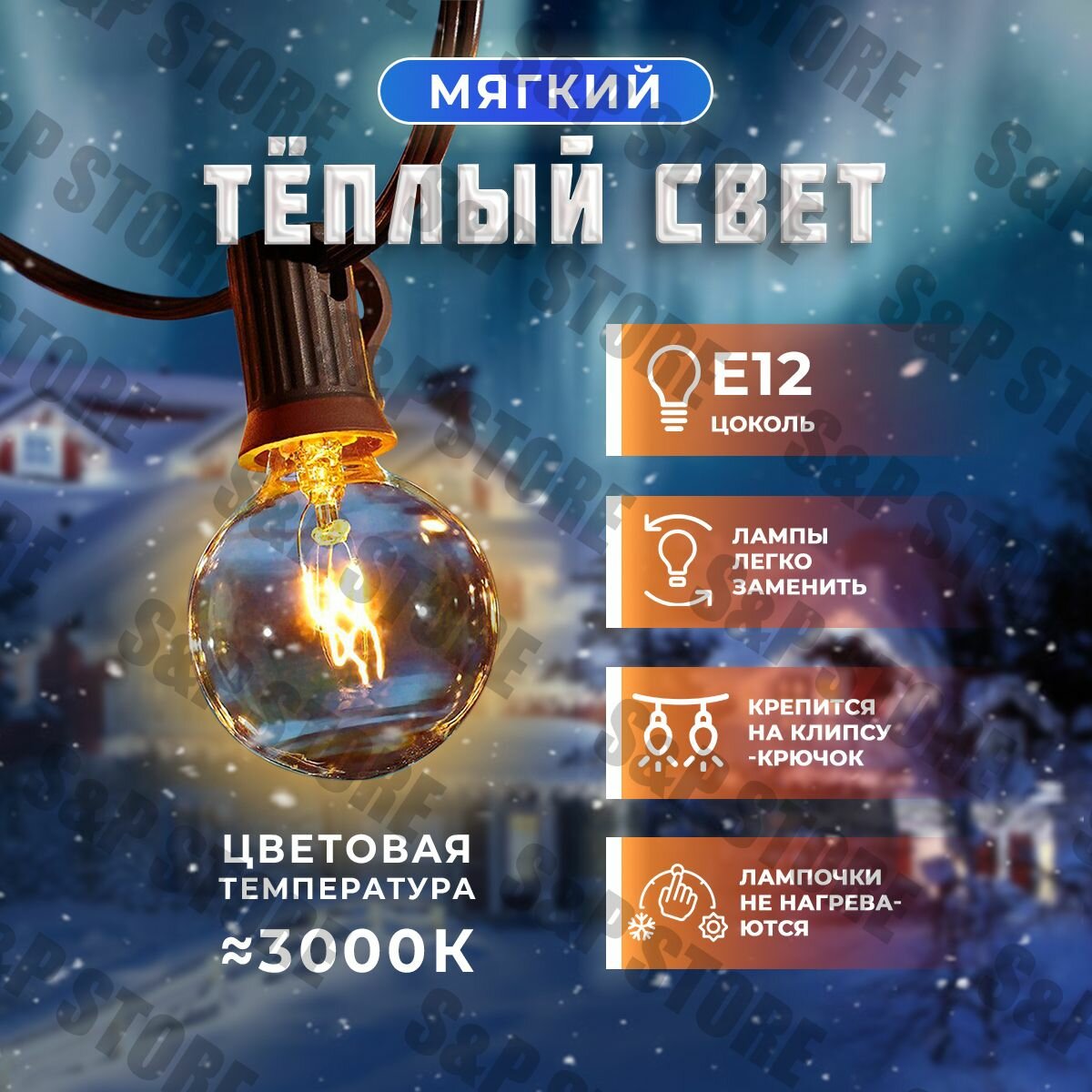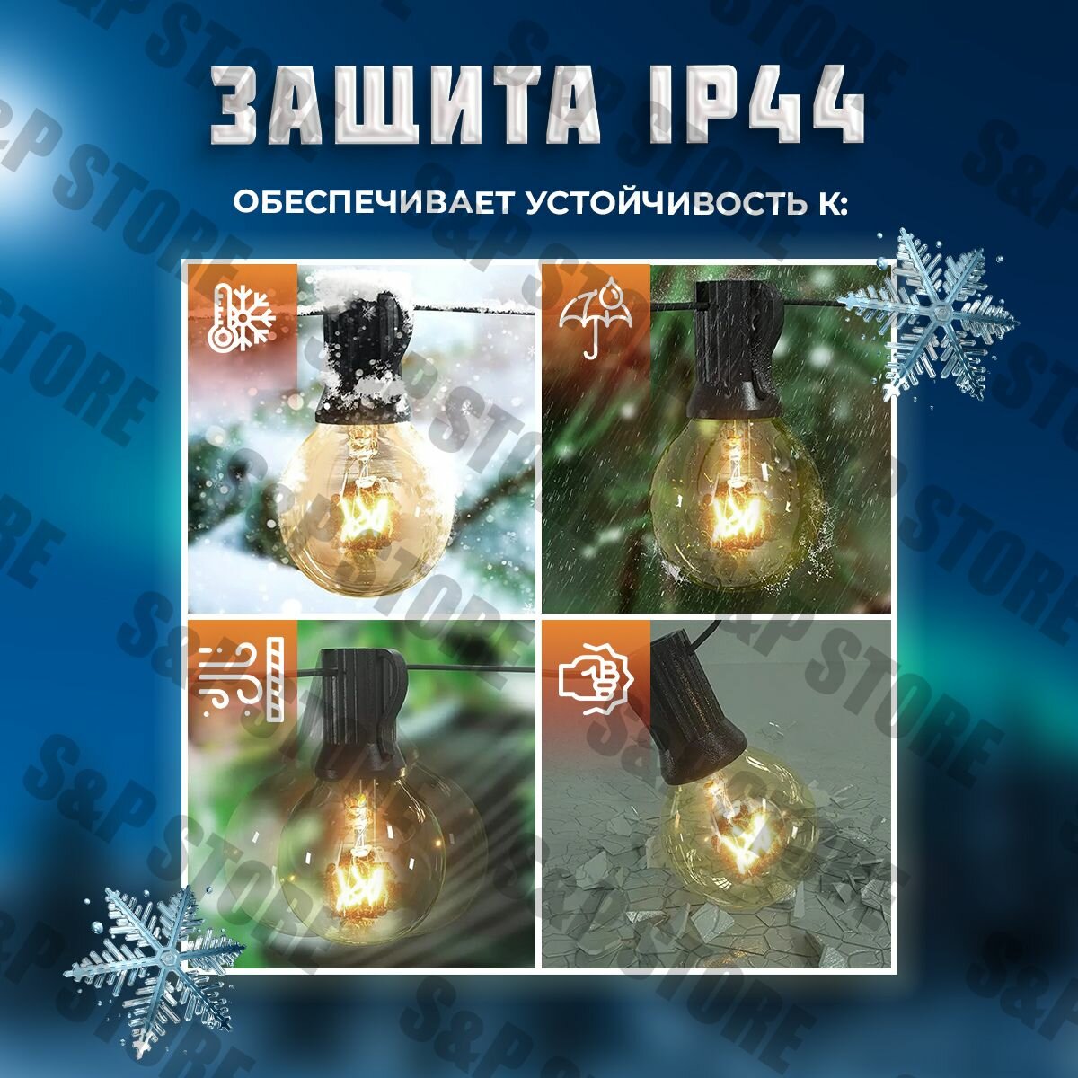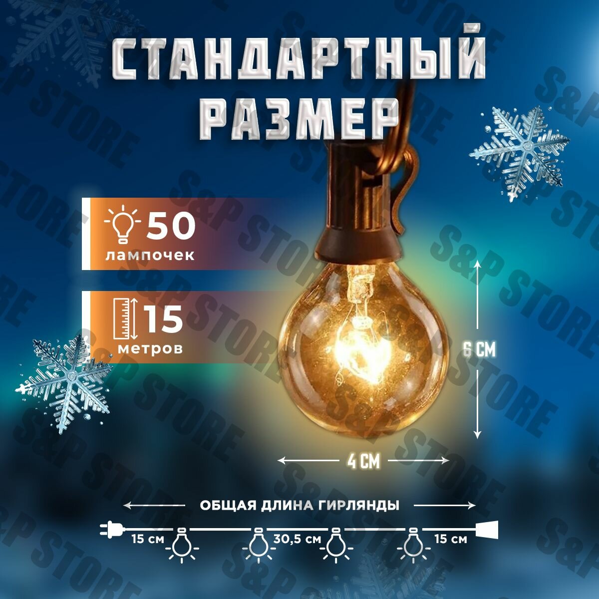 Электрогирлянда уличная, Ретро - лампочки накаливания 50 ламп, 15 м, iP 44, новогодняя, садовая, морозостойкая, Белт лайт интересное: