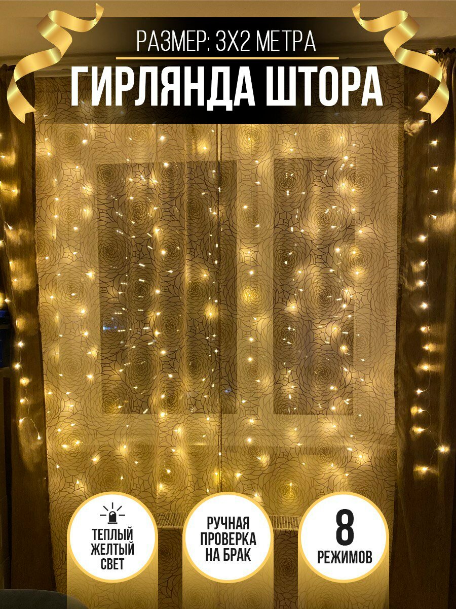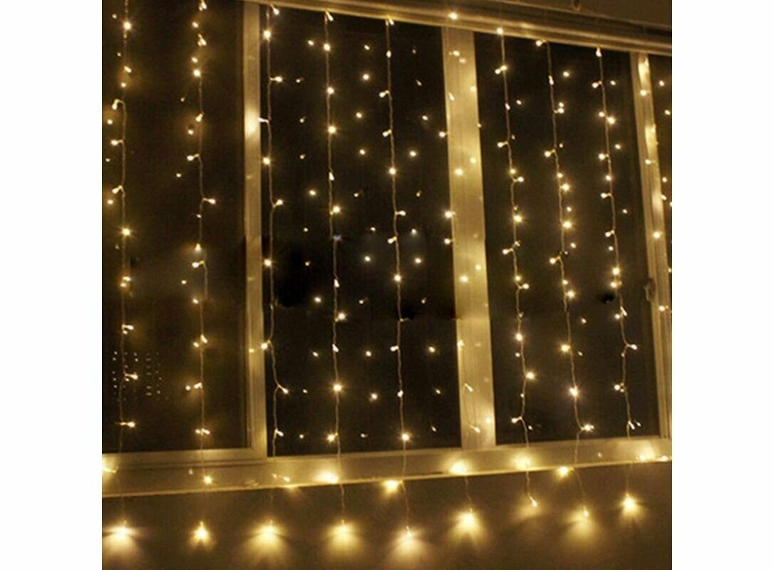Гирлянда электрическая светодиодная 3х2 метра / Гирлянда штора занавес новогодняя, желтый