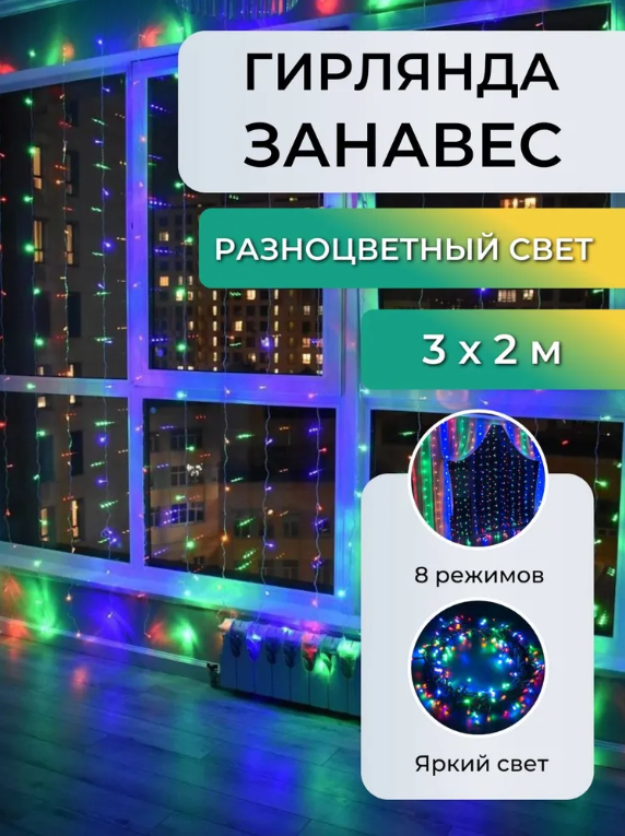 Гирлянда штора 3х2 на окно, разноцветный интересное:
