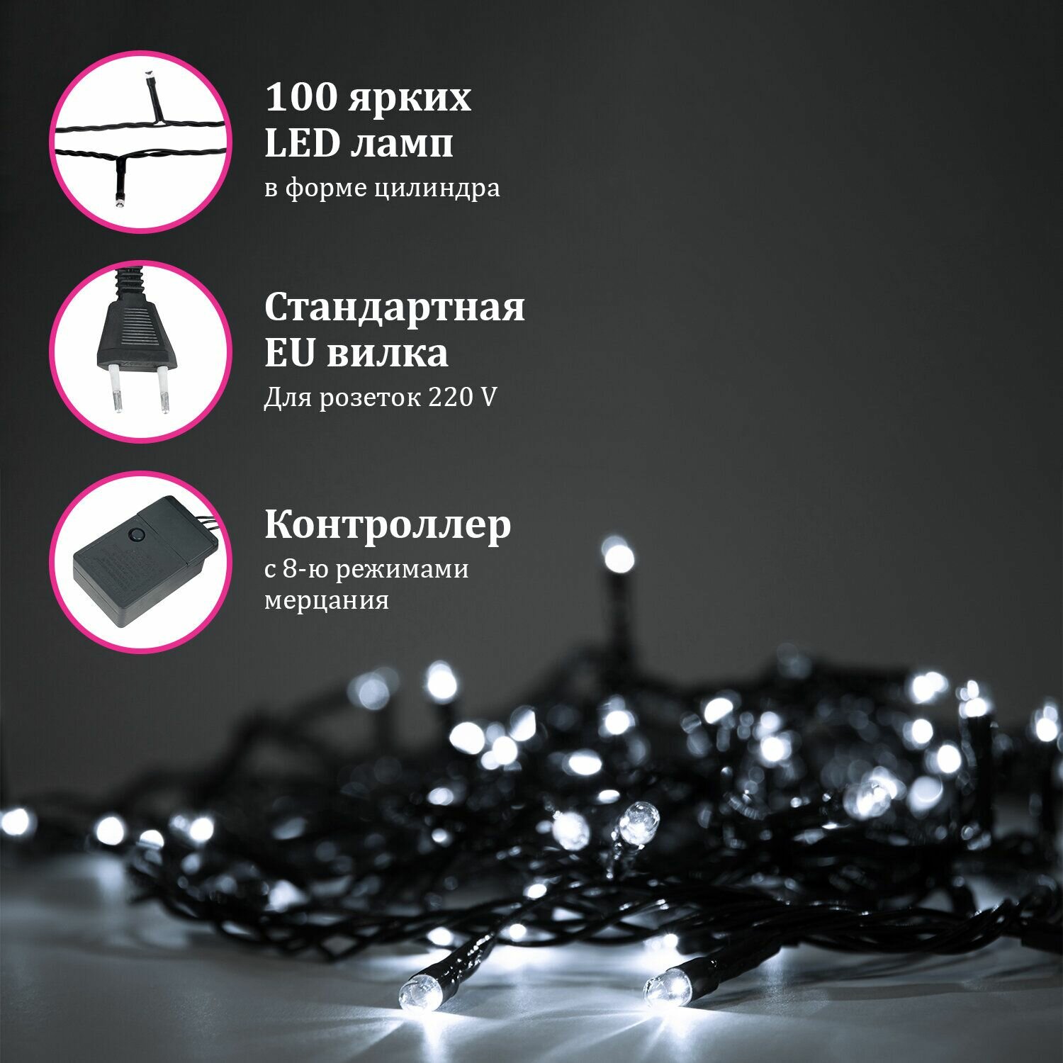 Купить Электрогирлянда-нить комнатная Золотая сказка Стандарт, 10 м, 100 LED, холодный белый свет, 220 V, контроллер