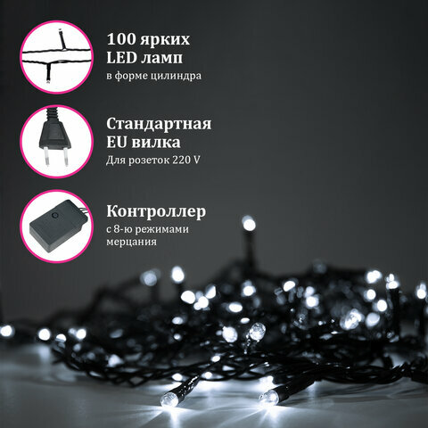 Электрогирлянда-нить комнатная Золотая сказка Стандарт, 10 м, 100 LED, холодный белый свет, 220 V, контроллер