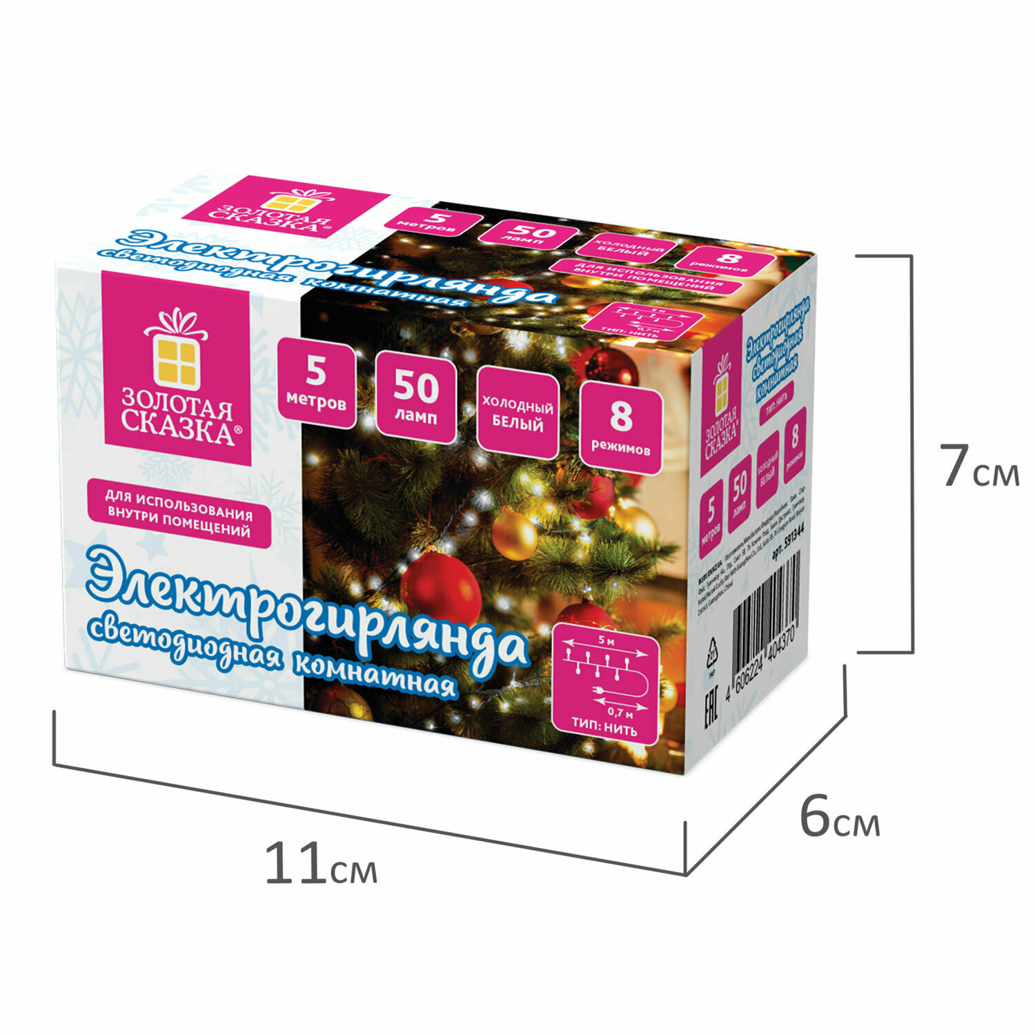 Электрогирлянда-нить комнатная Золотая сказка Стандарт, 5 м, 50 LED, холодный белый свет, 220 V, контроллер