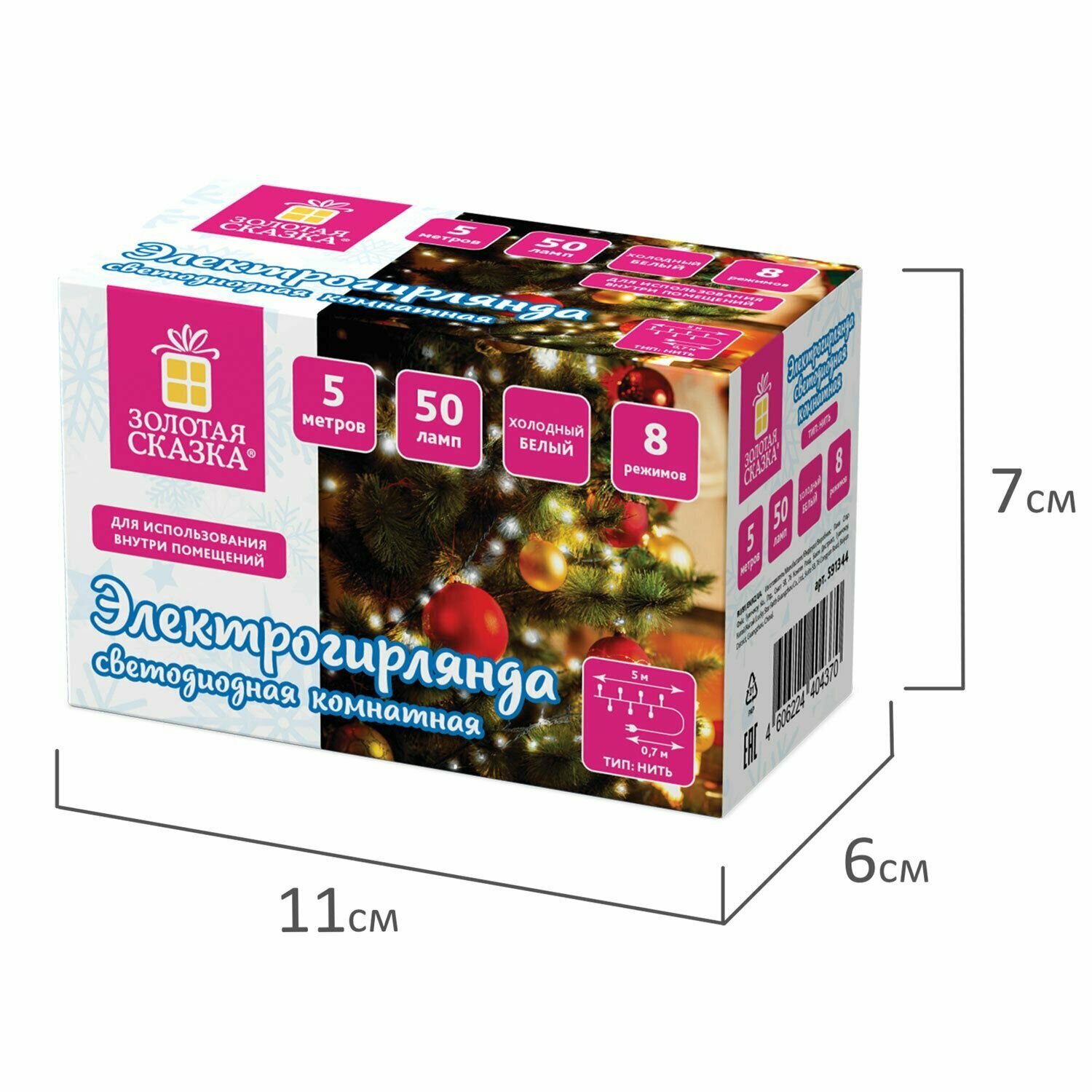 Купить Электрогирлянда-нить комнатная Золотая сказка Стандарт, 5 м, 50 LED, холодный белый свет, 220 V, контроллер