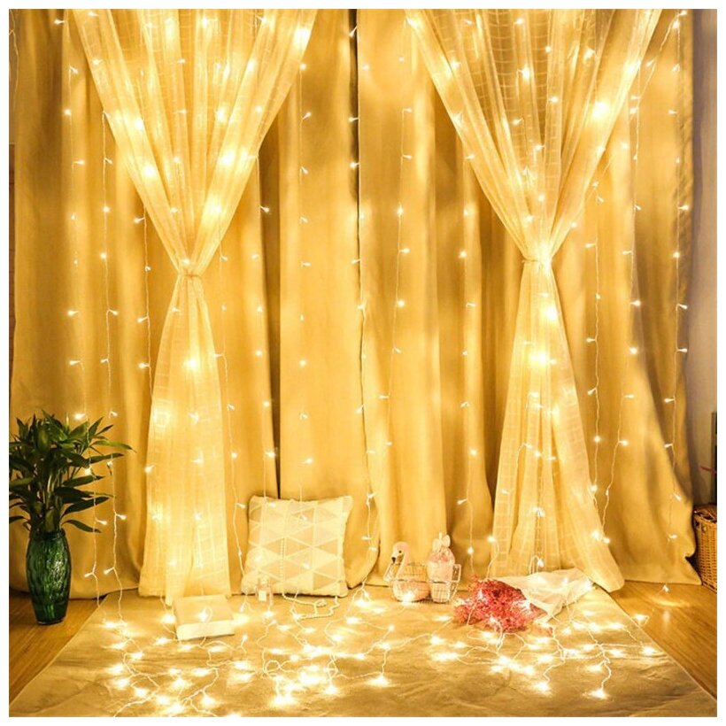 Светодиодная гирлянда-штора 3х3 / дождик / занавес / новогоднее украшение 300х300 см, теплый (желтый)