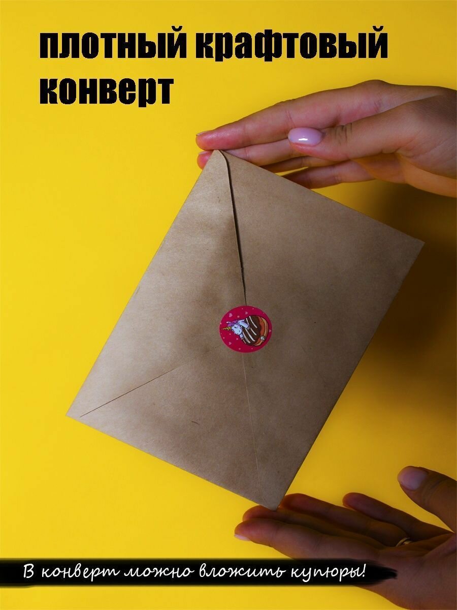 | Подробная комплектация | Поздравительная открытка 1 шт; крафт конверт для денег 1 шт.; наклейка стикер в подарок 1 шт. |