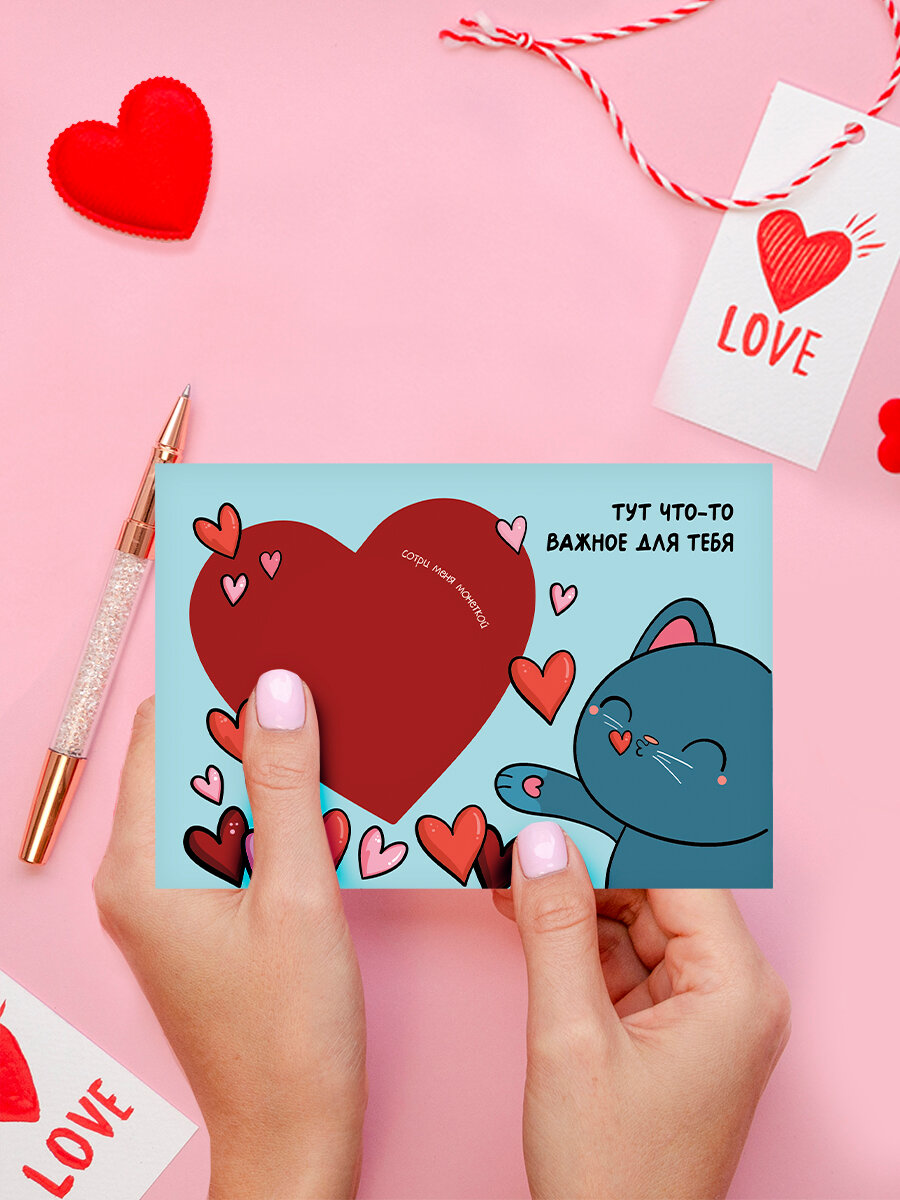 Скретч открытка любимому, подруге, девушке в конверте Котик интересное: