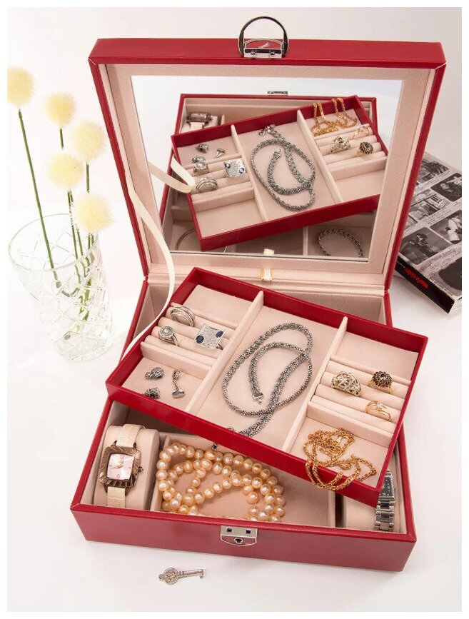 Шкатулка для украшений "Милана", 25x25x8,5 см, красная, классическая, с зеркалом и замком интересное: