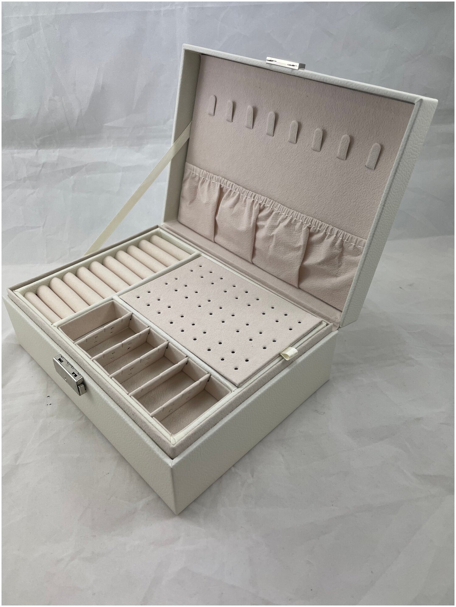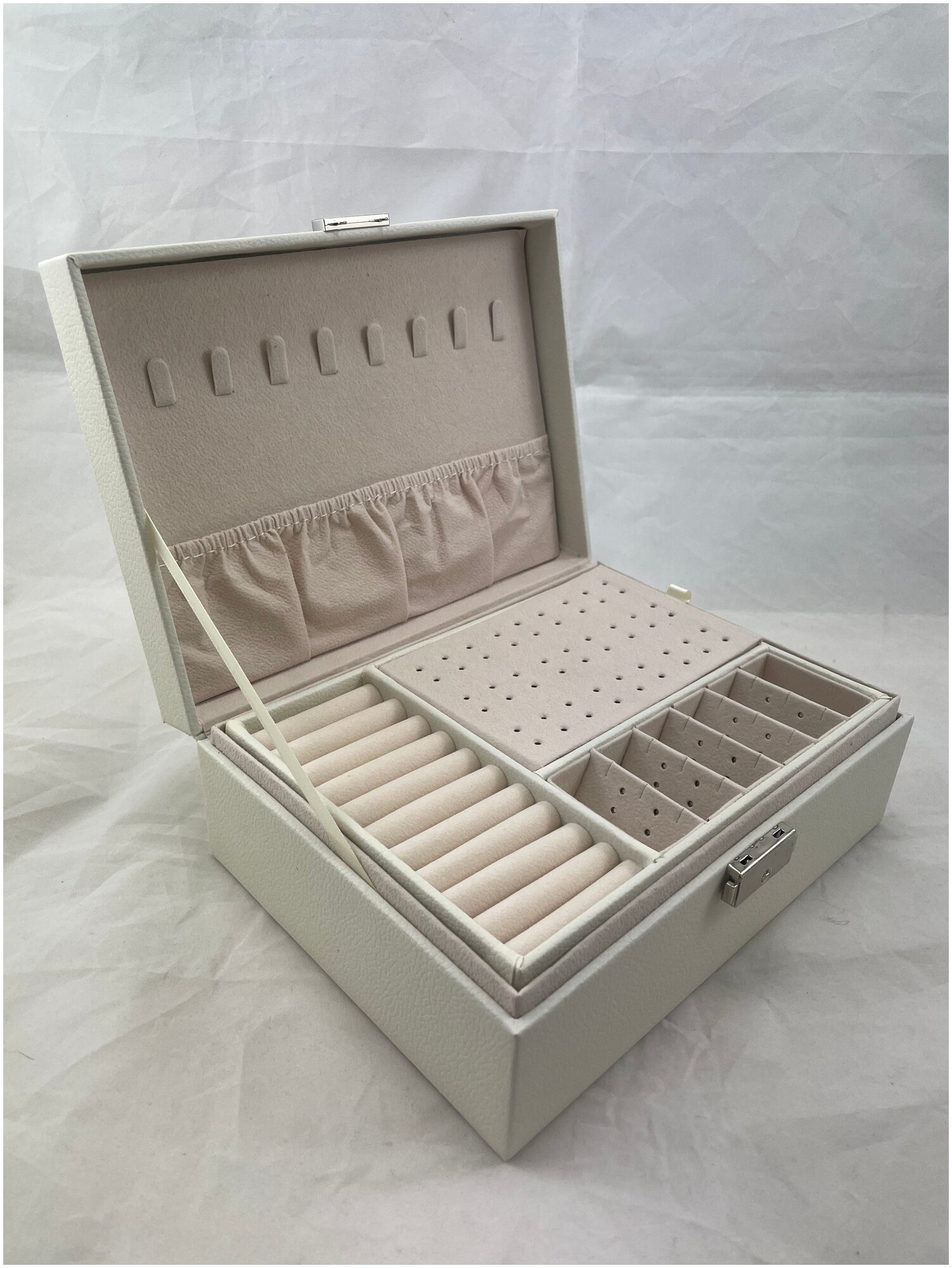 Купить Шкатулка для украшений, органайзер для хранения бижутерии, эко-кожа, светло-бежевый, молочный оттенок, 14 отделений, 2 яруса, на замке
