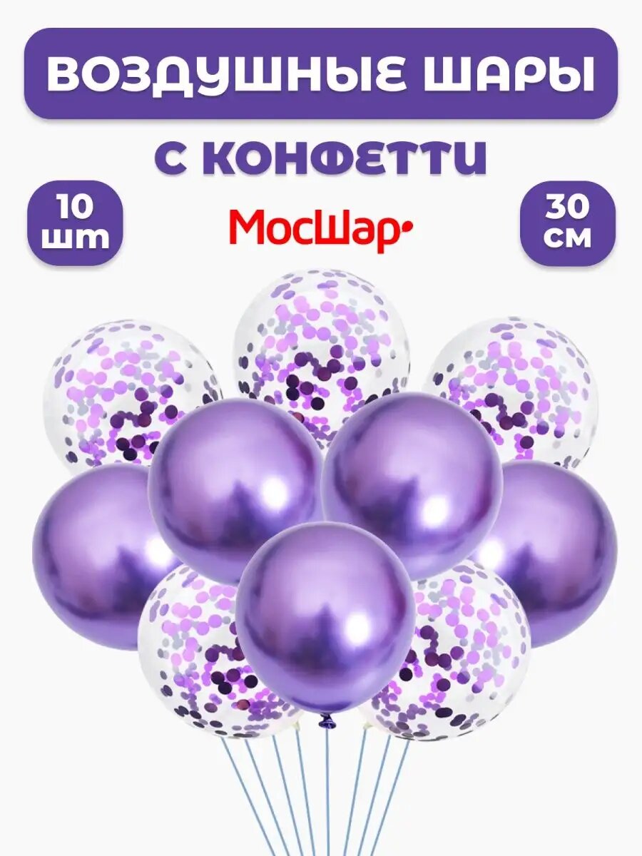 Купить Набор воздушных латексных шаров мосшар, конфетти -10шт, высота 30см, цвет фиолетовый