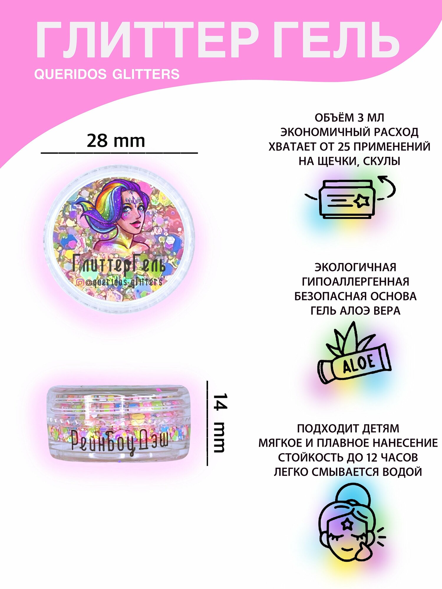 Купить Queridos Glitters ГлиттерГель. Блёстки для лица и тела. Цвет "Рейнбоудэш" 3 мл.