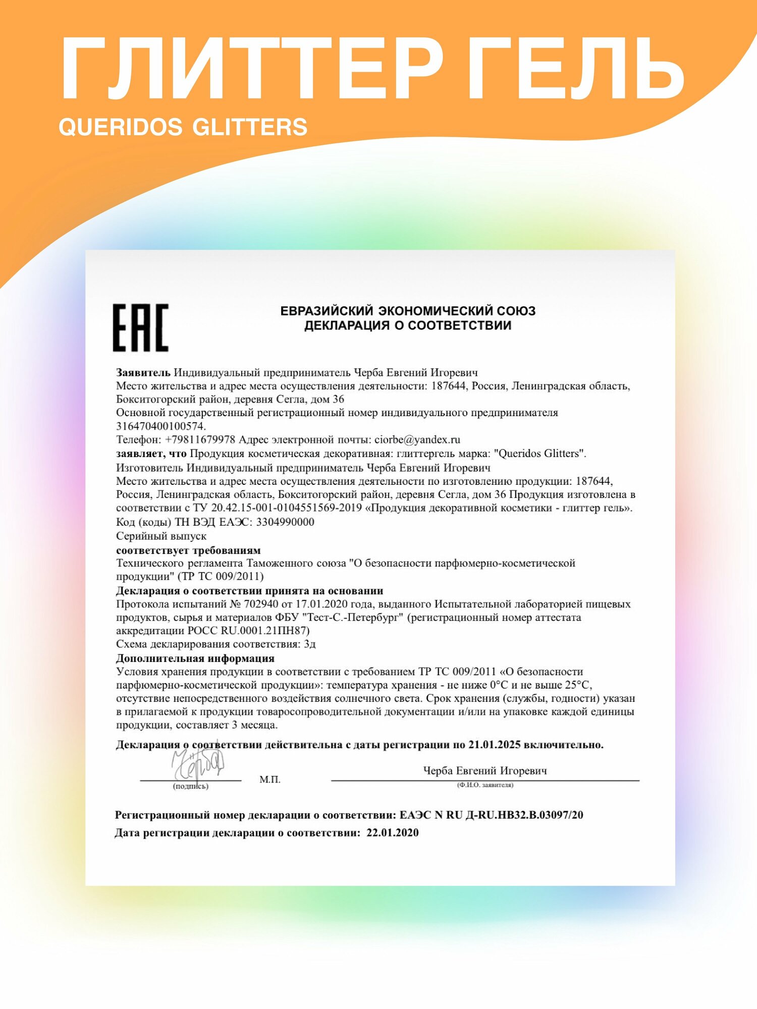 Queridos Glitters ГлиттерГель. Блёстки для лица и тела. Цвет "Эрагон" 3 мл.