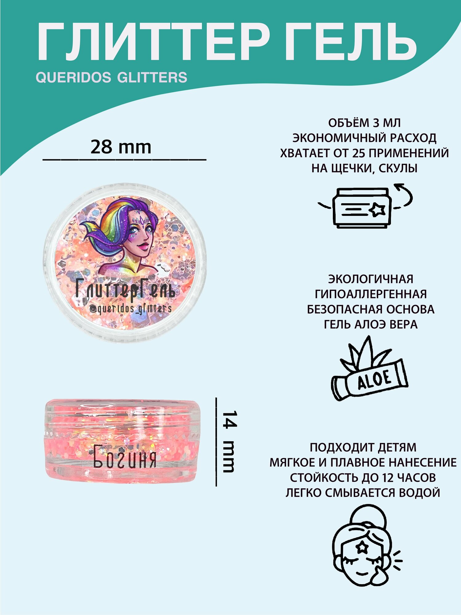 Купить Queridos Glitters ГлиттерГель. Блёстки для лица и тела. Цвет "Богиня" 3 мл.