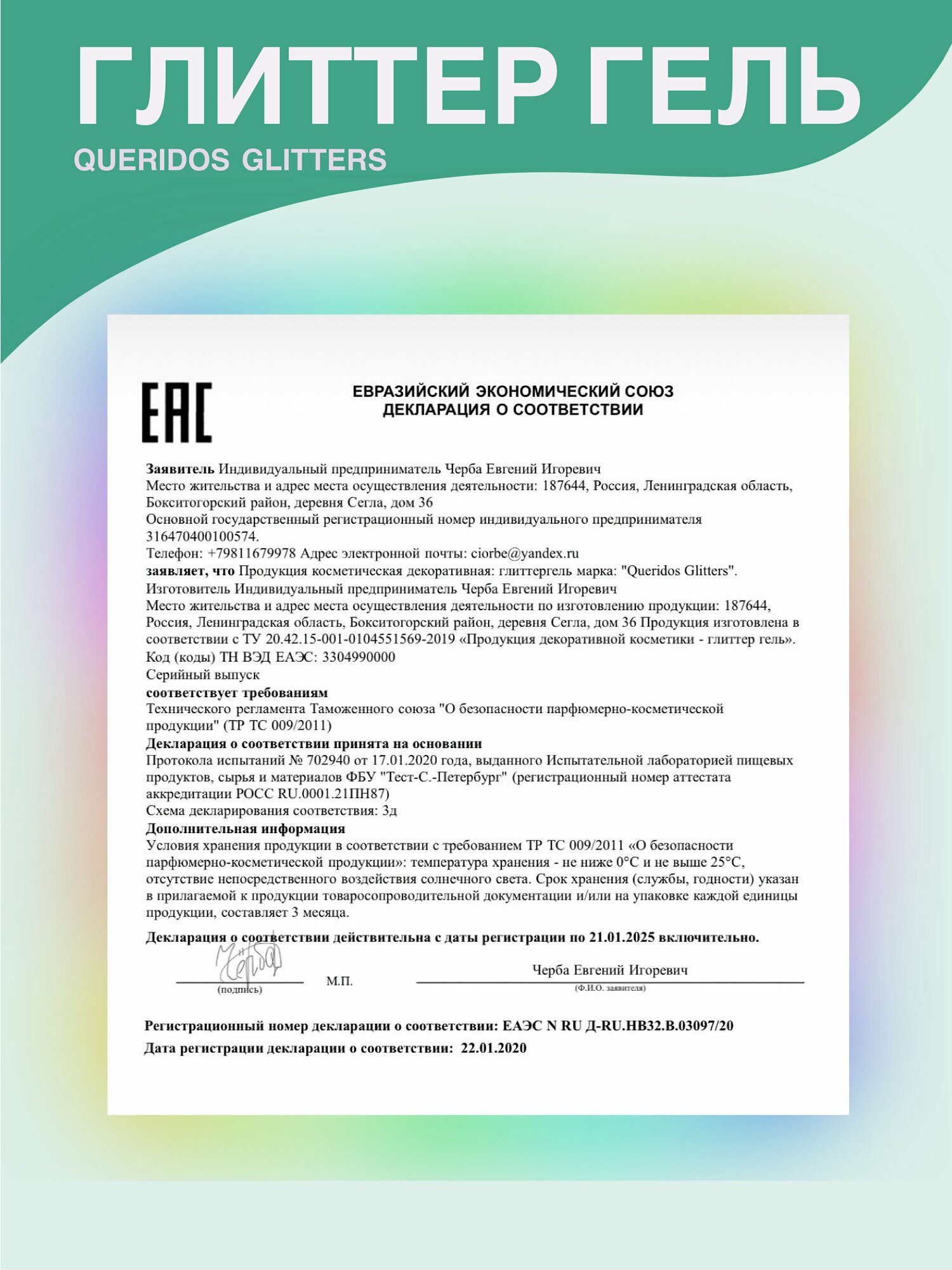 Queridos Glitters ГлиттерГель. Блёстки для лица и тела. Цвет "Павлин" 3 мл.