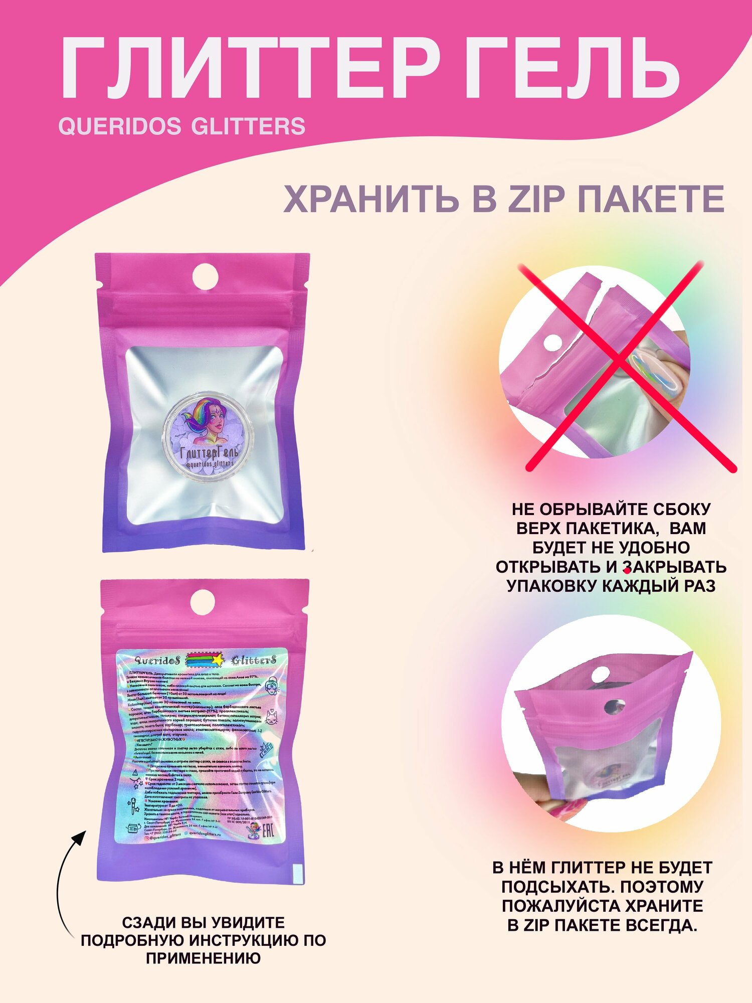 Queridos Glitters ГлиттерГель. Блёстки для лица и тела. Цвет "Глянец" 3 мл.