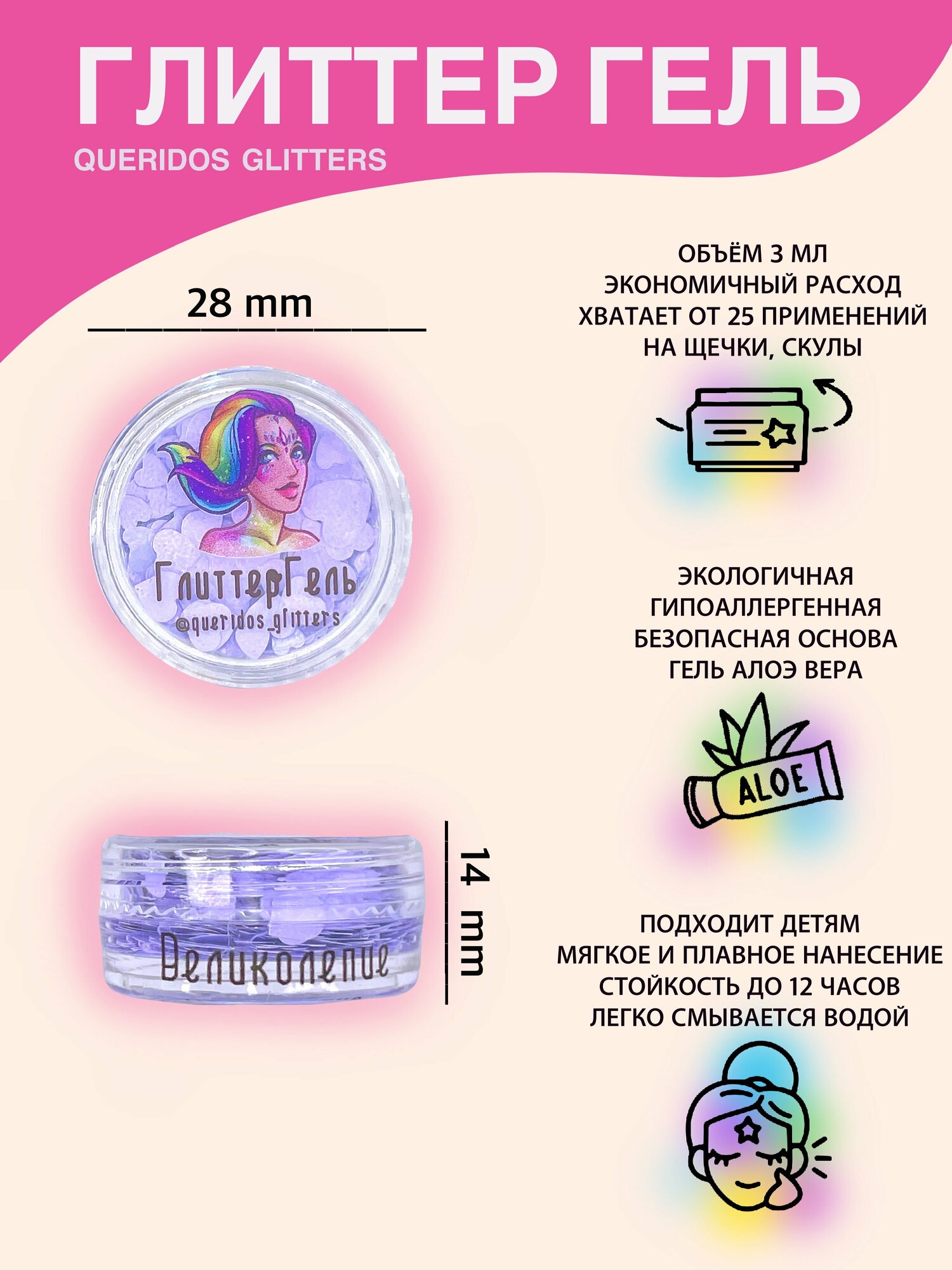 Queridos Glitters ГлиттерГель. Блёстки для лица и тела. Цвет "Литтл Пинк" 3 мл.