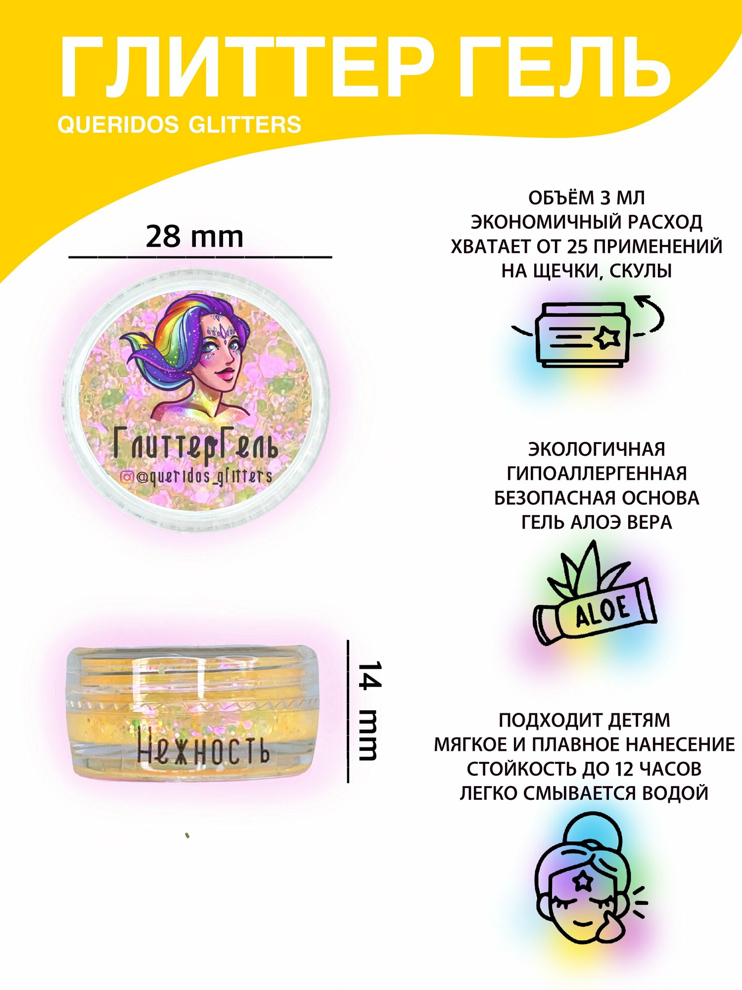 Queridos Glitters Глиттергель. Блёстки для лица и тела. Цвет "Венера" 3 мл.