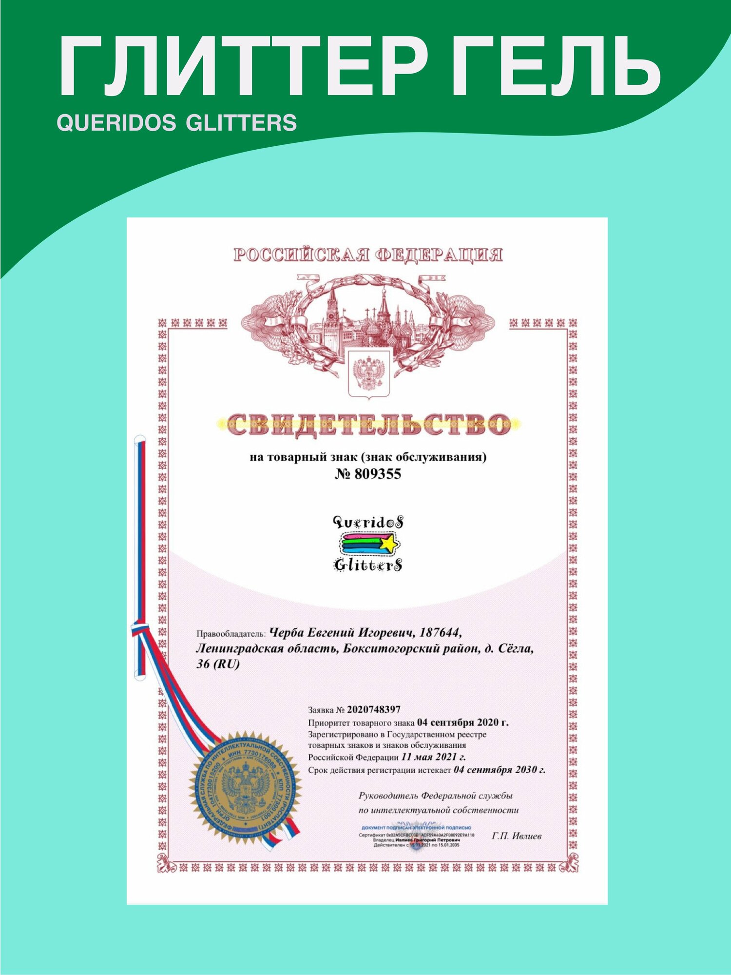 Queridos Glitters ГлиттерГель. Блёстки для лица и тела. Цвет "Павлин" 3 мл.