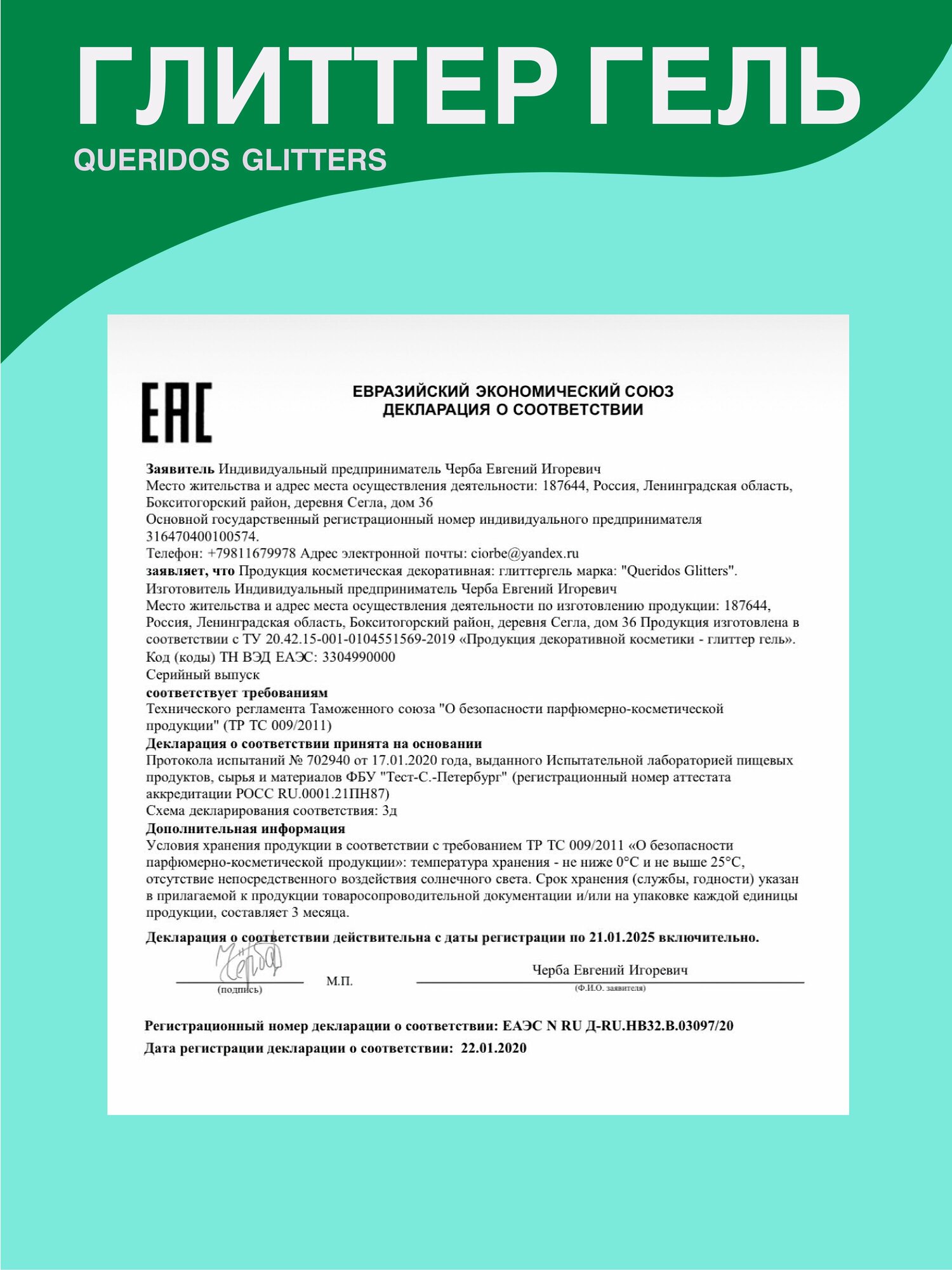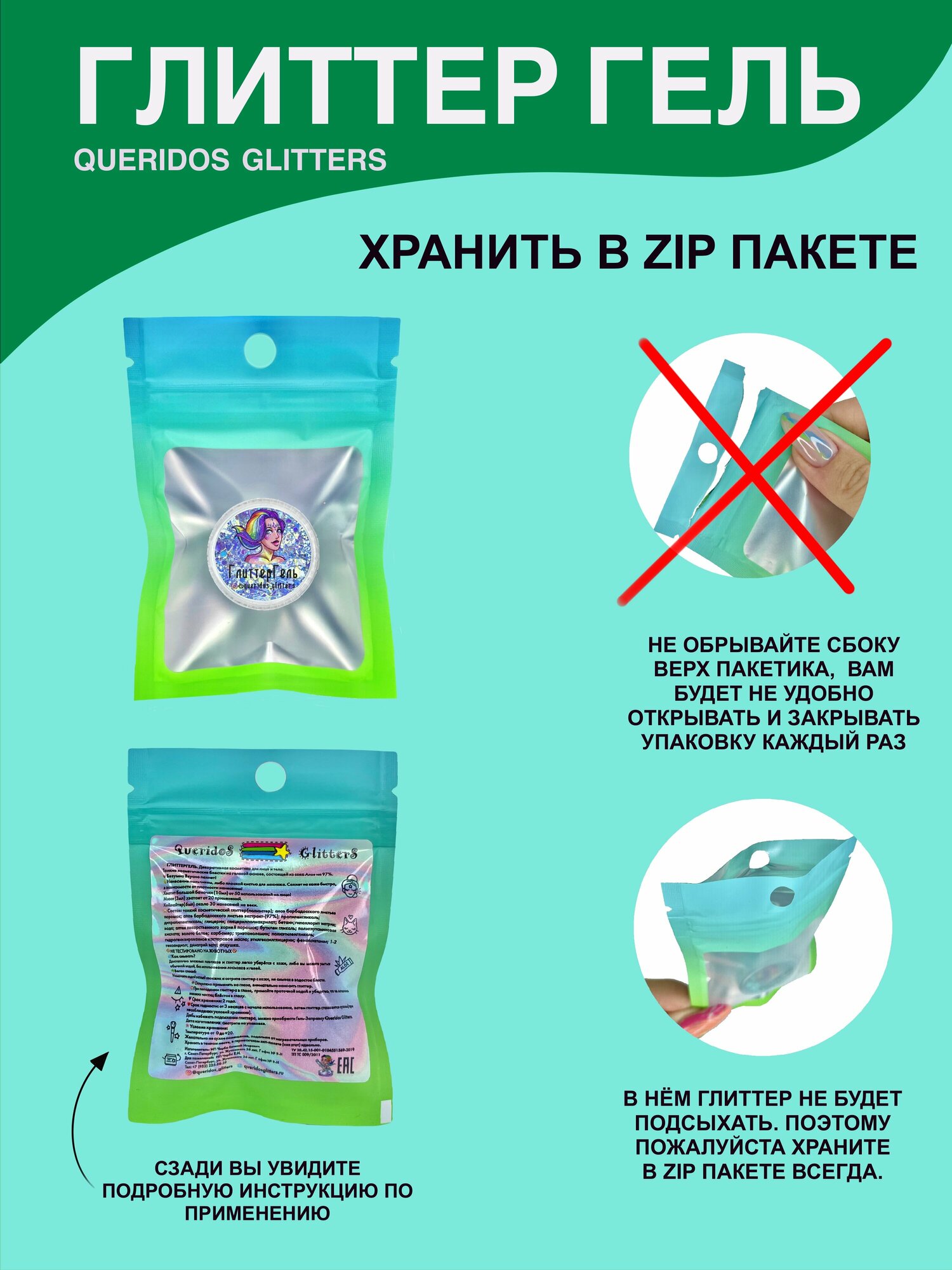 Queridos Glitters ГлиттерГель. Блёстки для лица и тела. Цвет "Бирюза" 3 мл.