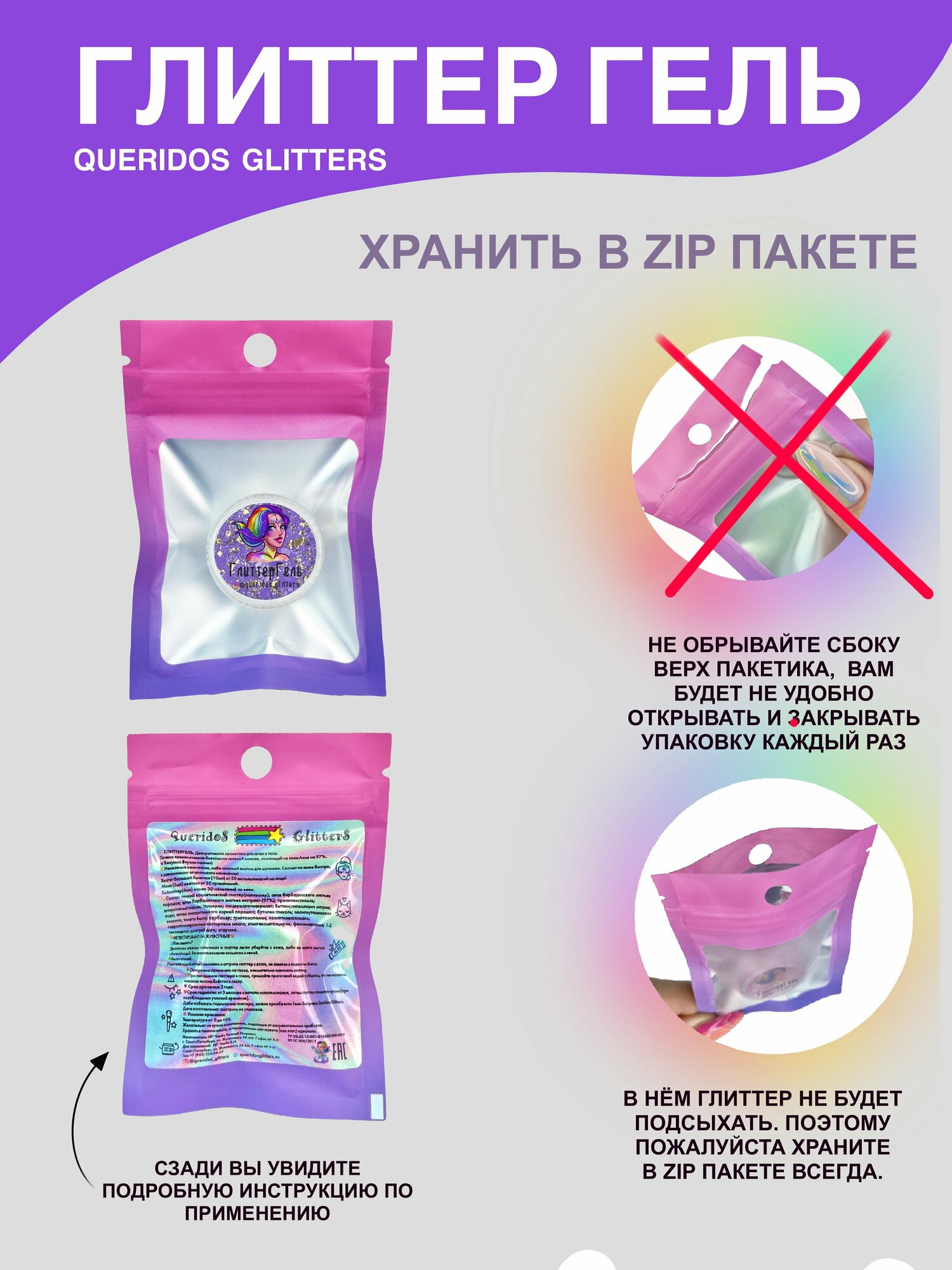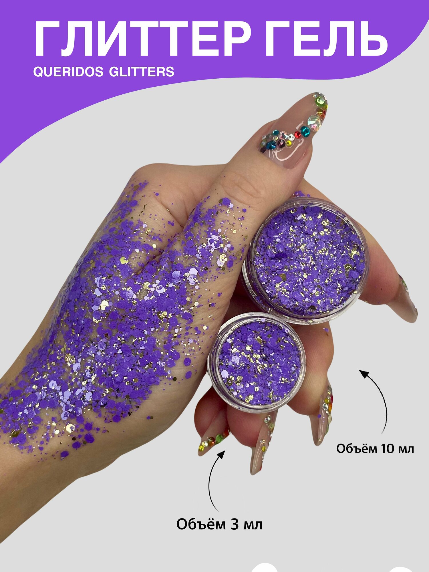 Queridos Glitters ГлиттерГель. Блёстки для лица и тела. Цвет "Фиолент" 3 мл.