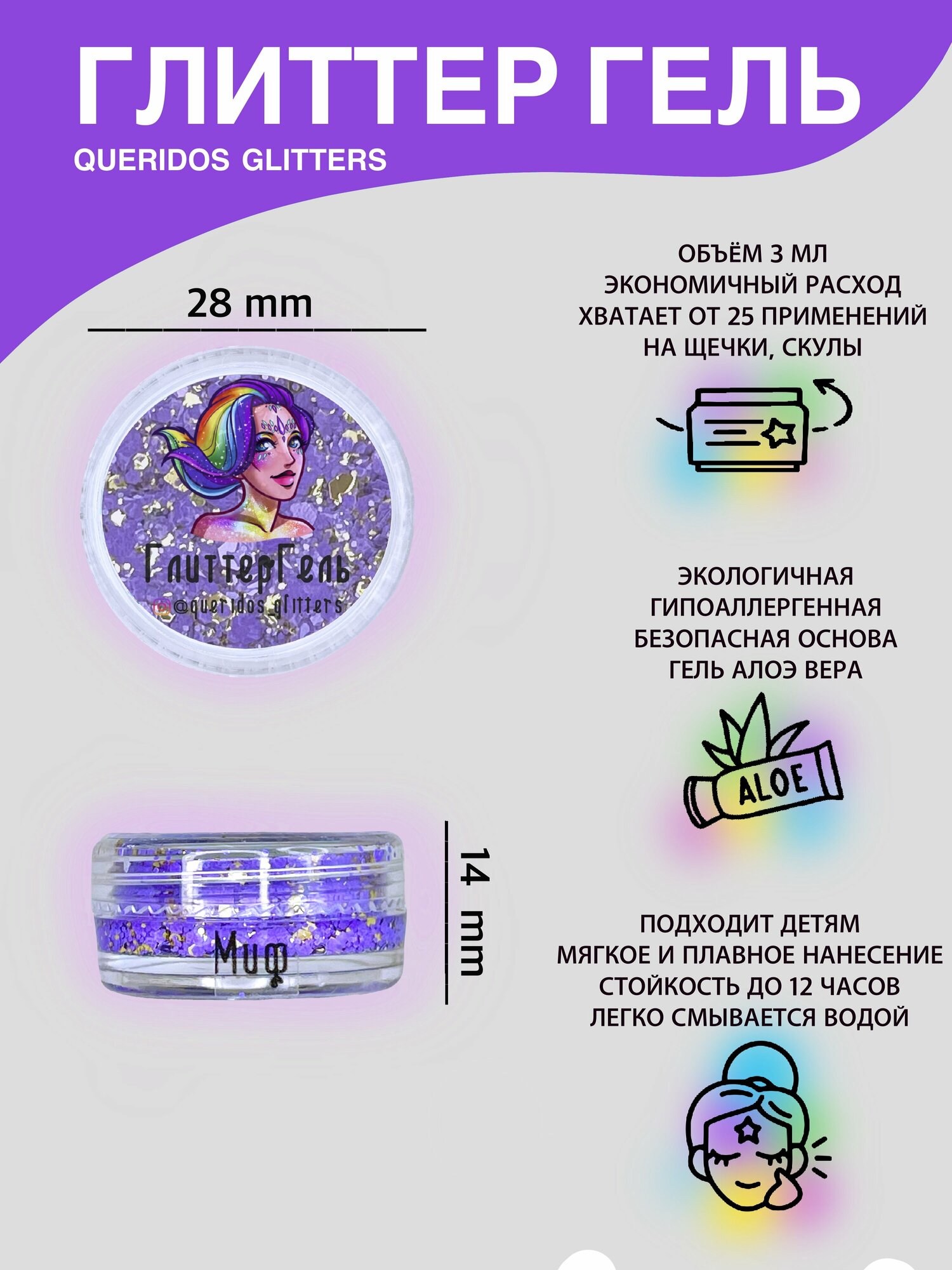 Купить Queridos Glitters ГлиттерГель. Блёстки для лица и тела. Цвет "Миф" 3 мл.